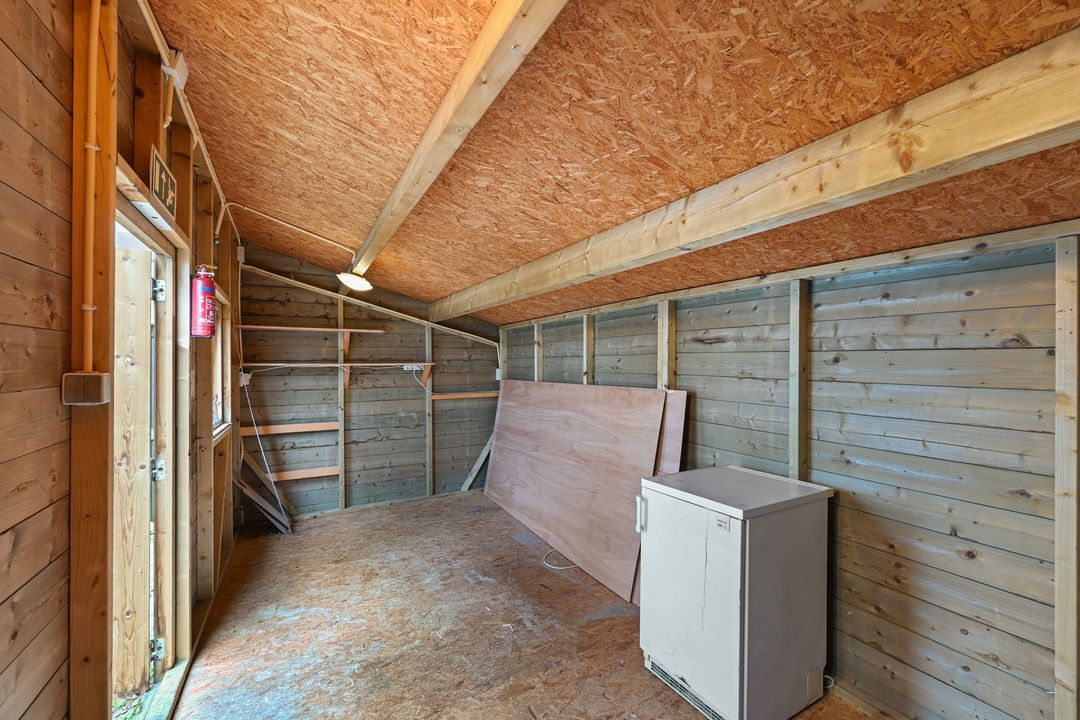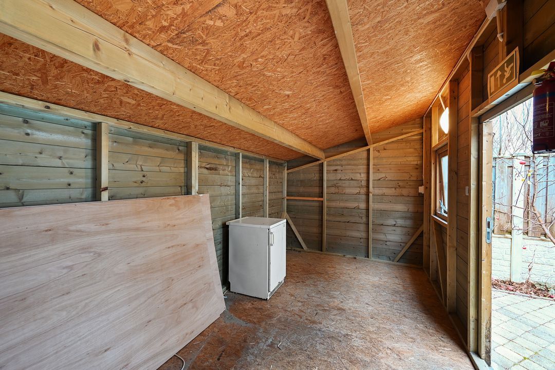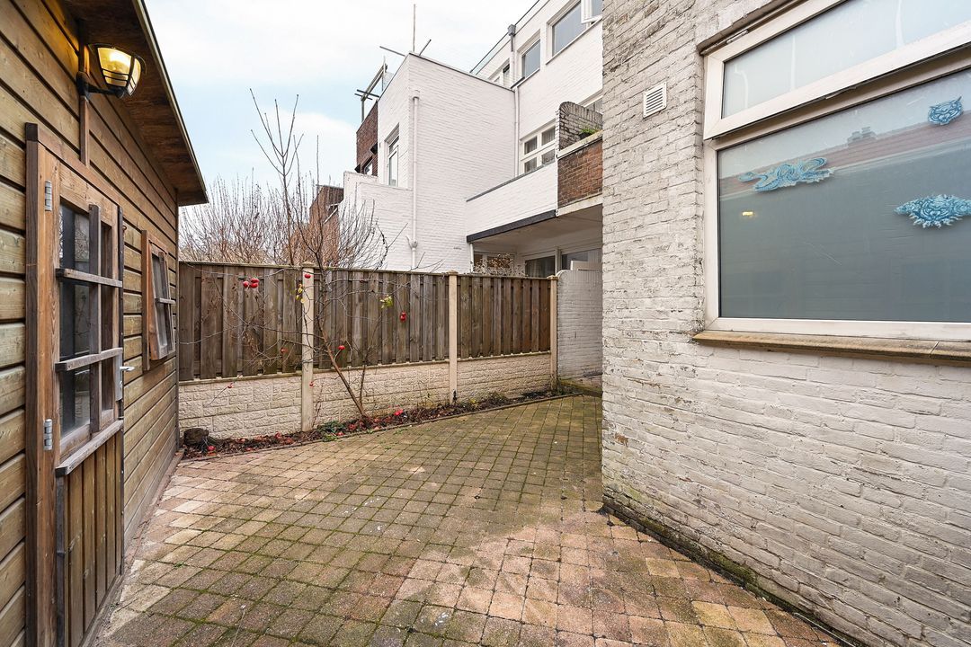 De diepe achtertuin is grotendeels bestraat en daarmee onderhoudsarm, maar biedt ook volop ruimte voor groen en zitplekken. Achterin de tuin bevindt zich een grote houten berging (ca. 12 m²) met dubbele deuren – perfect voor fietsen, opslag of een werkplaats.