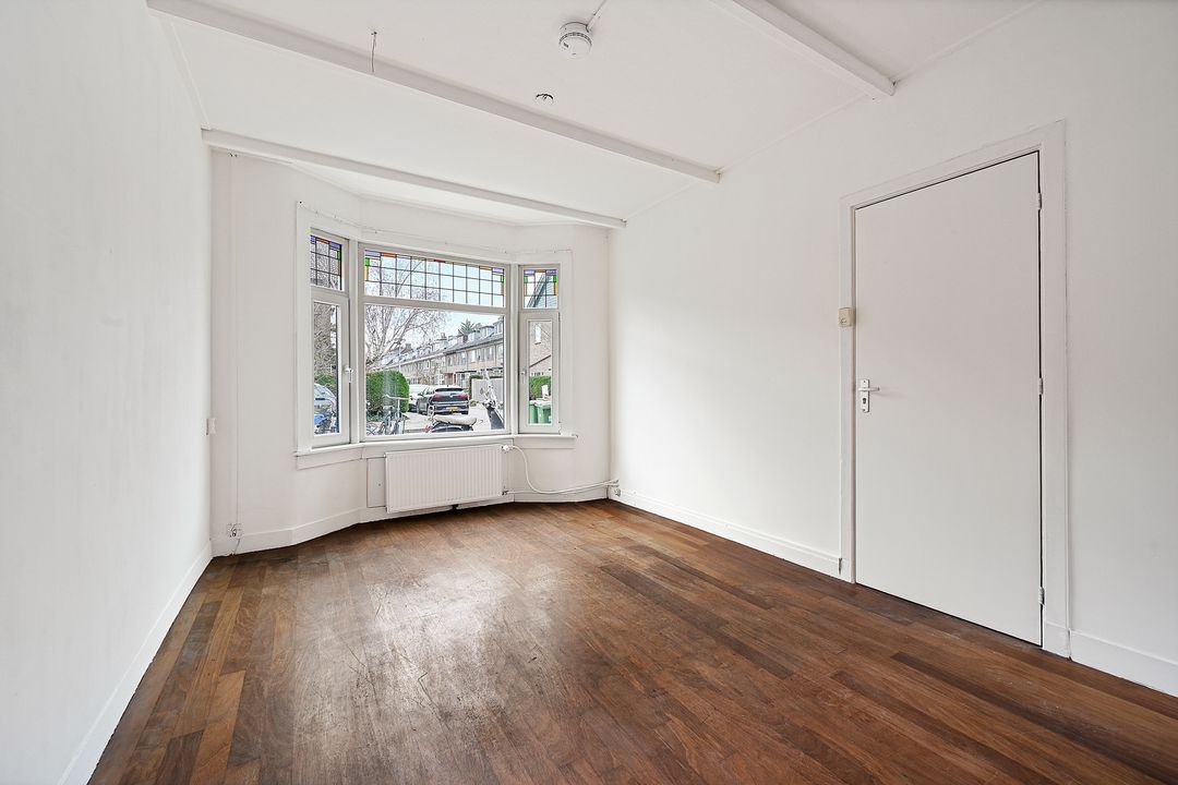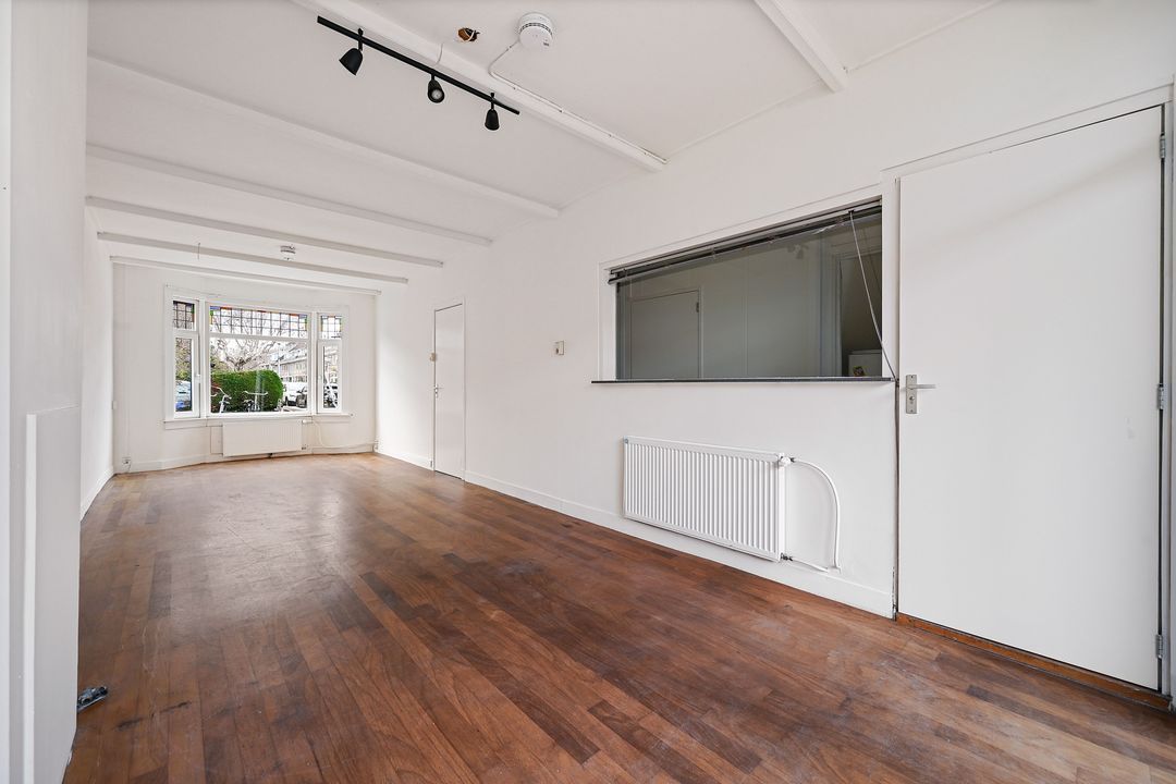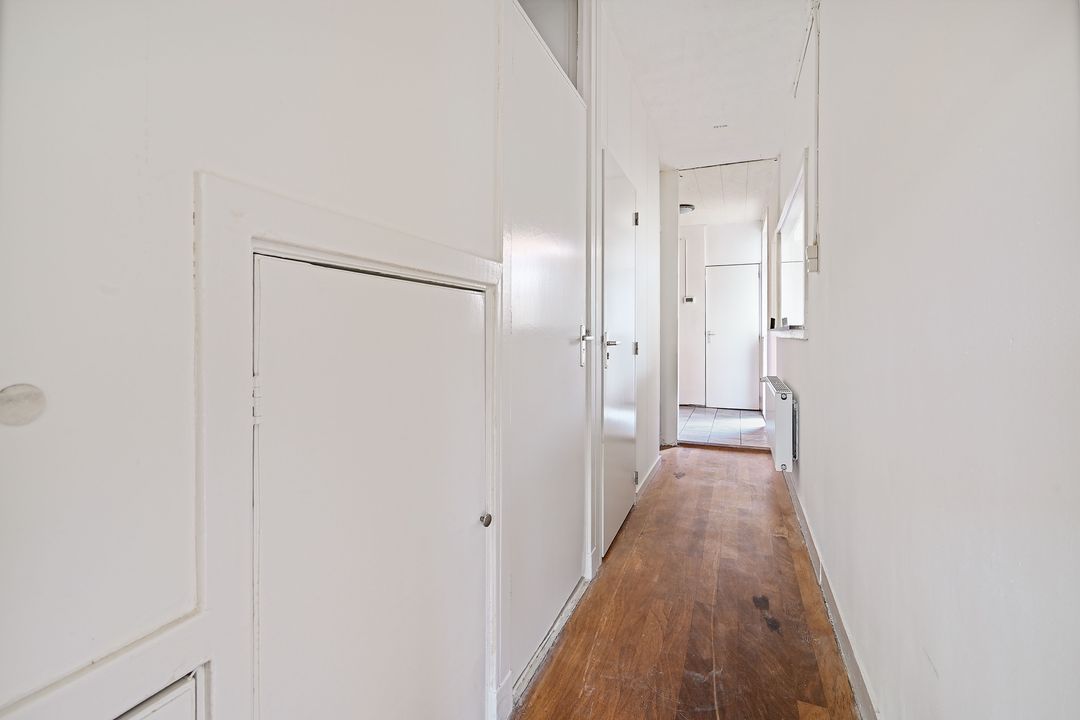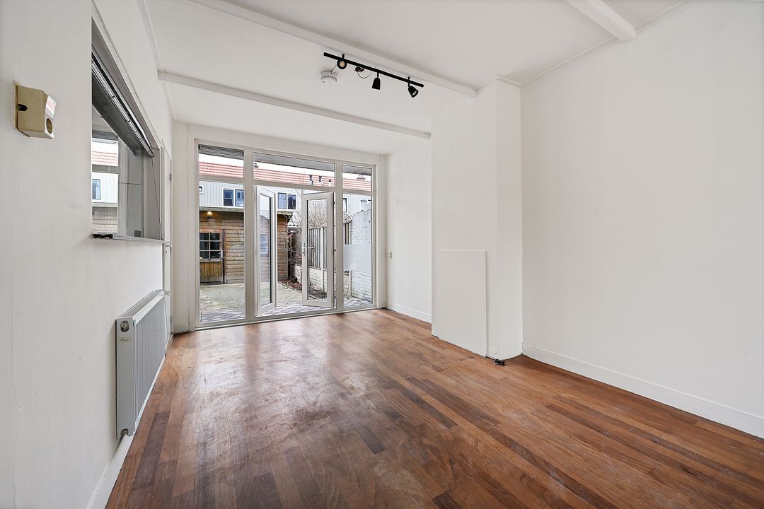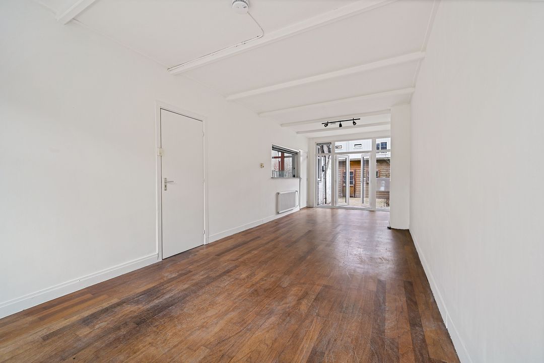Entree via hal met toiletruimte en 2 vaste kasten. De ruime woonkamer met hoog plafond, houten vloer en erker aan de voorzijde biedt heerlijk veel licht. Aan de tuinzijde is via openslaande deuren de achtertuin bereikbaar.