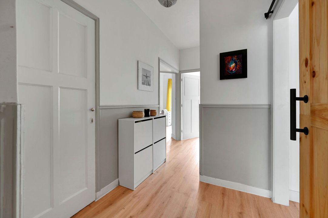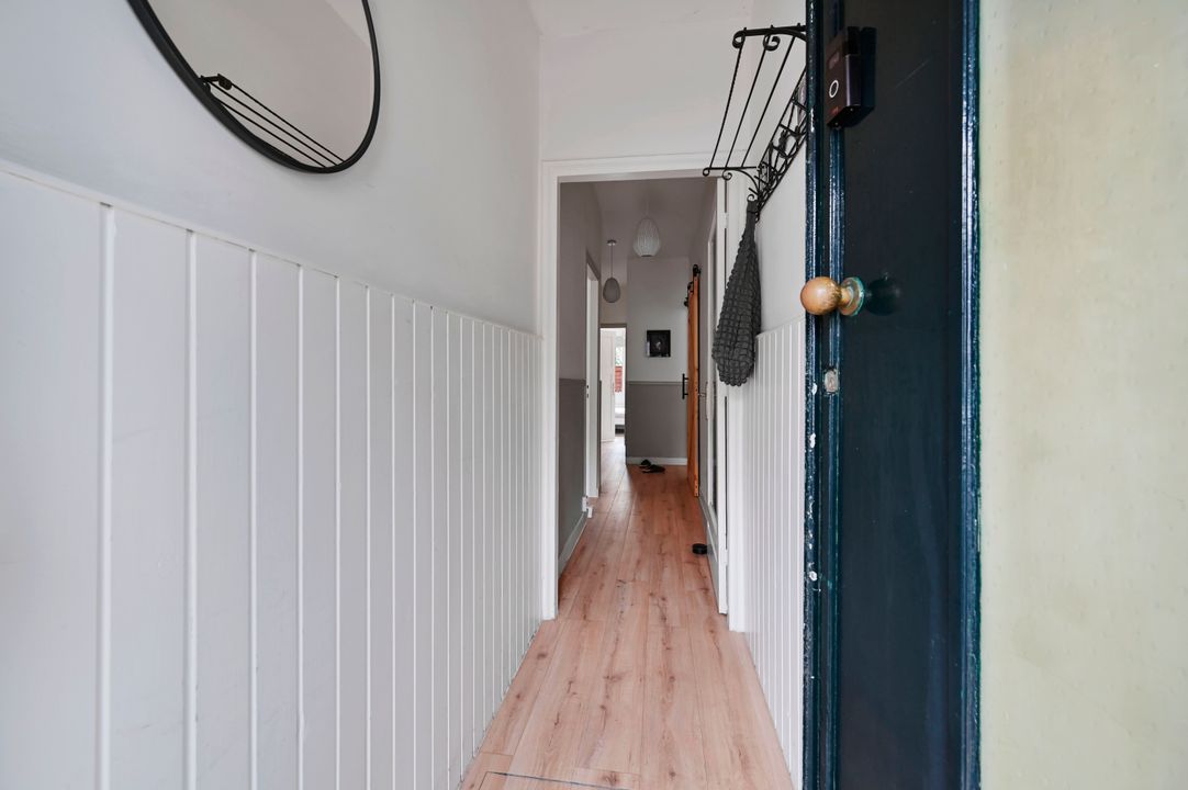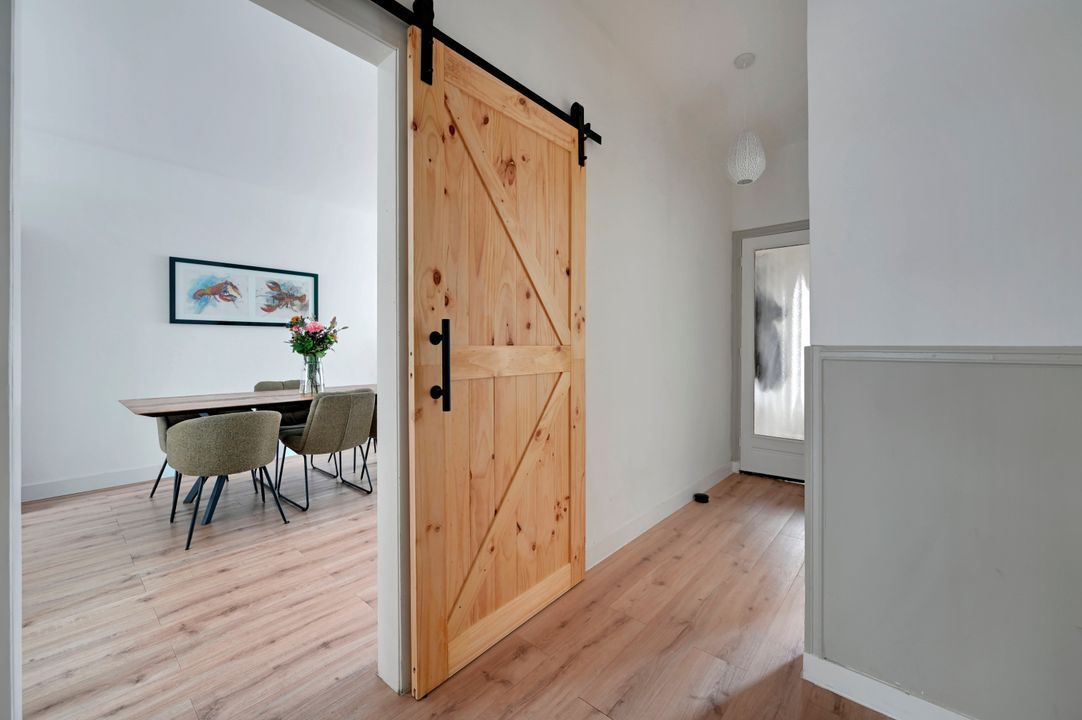 De ruime hal (ca. 7,8 m²) vormt het hart van de woning en biedt toegang tot alle vertrekken. In de hal bevinden zich een vaste kast, de meterkast en de separate toiletruimte met modern tegelwerk.