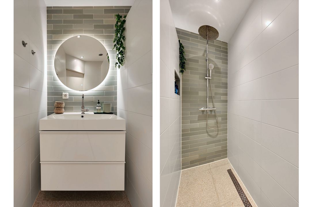 De moderne badkamer (ca. 3,9 m²) is voorzien van een inloopdouche, wastafelmeubel en nette betegeling.