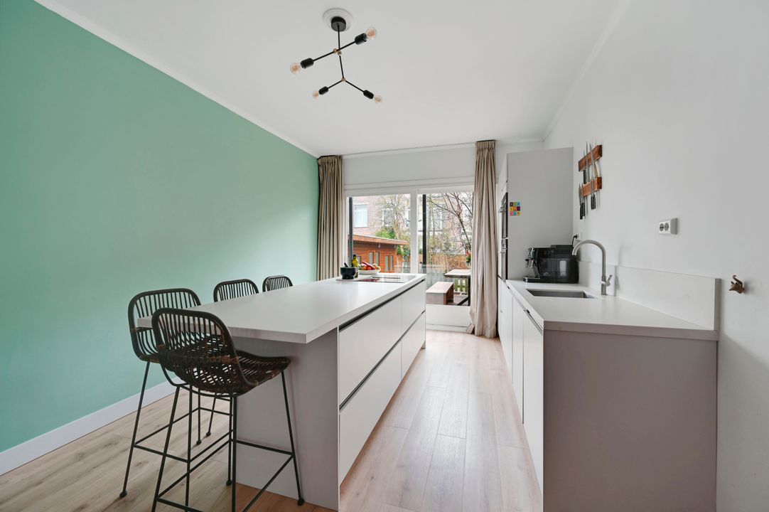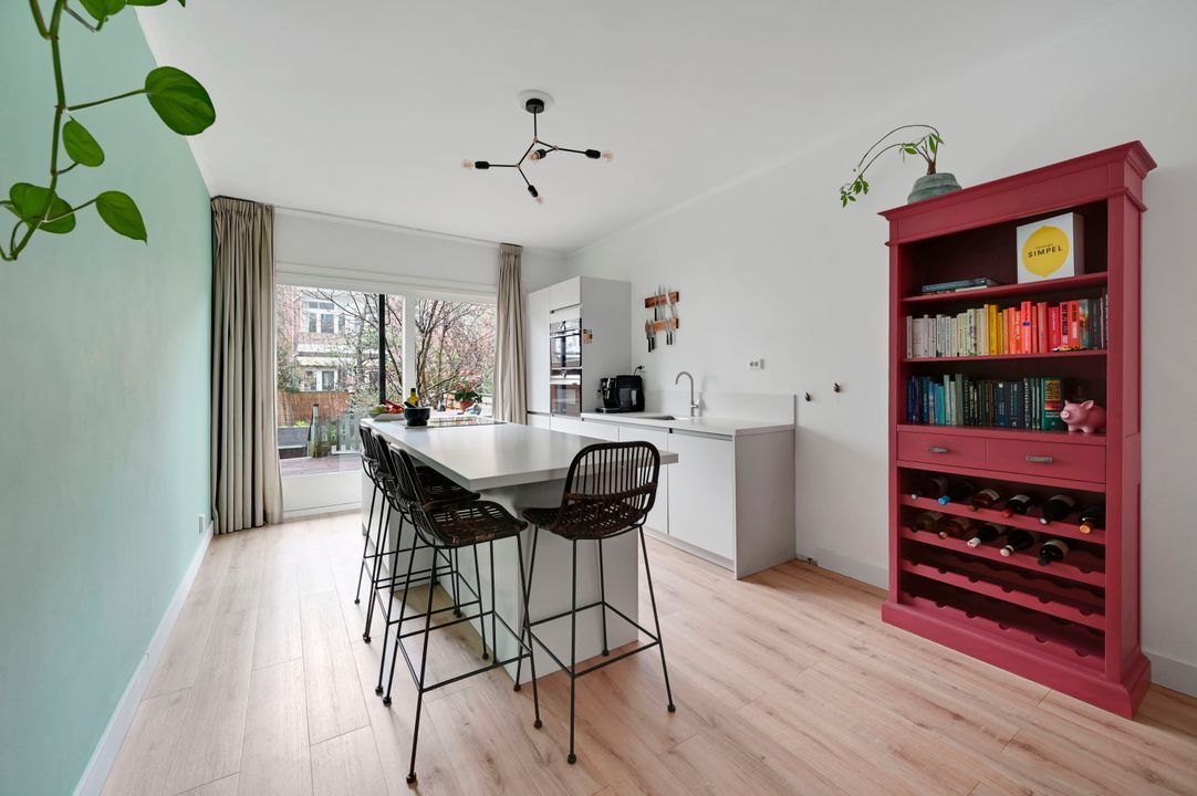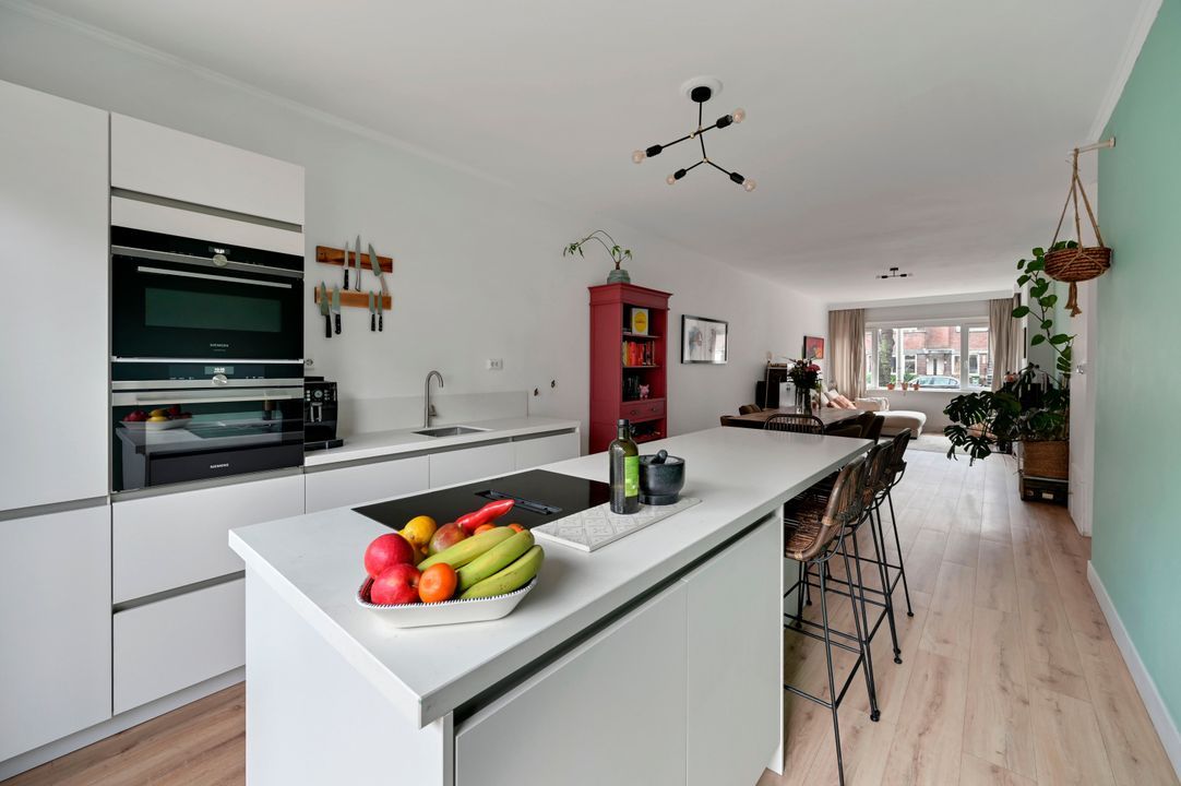 De open keuken aan de tuinzijde (ca. 12,7 m²) is voorzien van een moderne keukenopstelling uit 2021. De keuken beschikt over hoogwaardige Siemens-inbouwapparatuur, waaronder een inductiekookplaat, oven, stoomoven, vaatwasser en koelkast, en is afgewerkt met een stijlvol composiet werkblad. Er is ruim voldoende werk- en kastruimte.