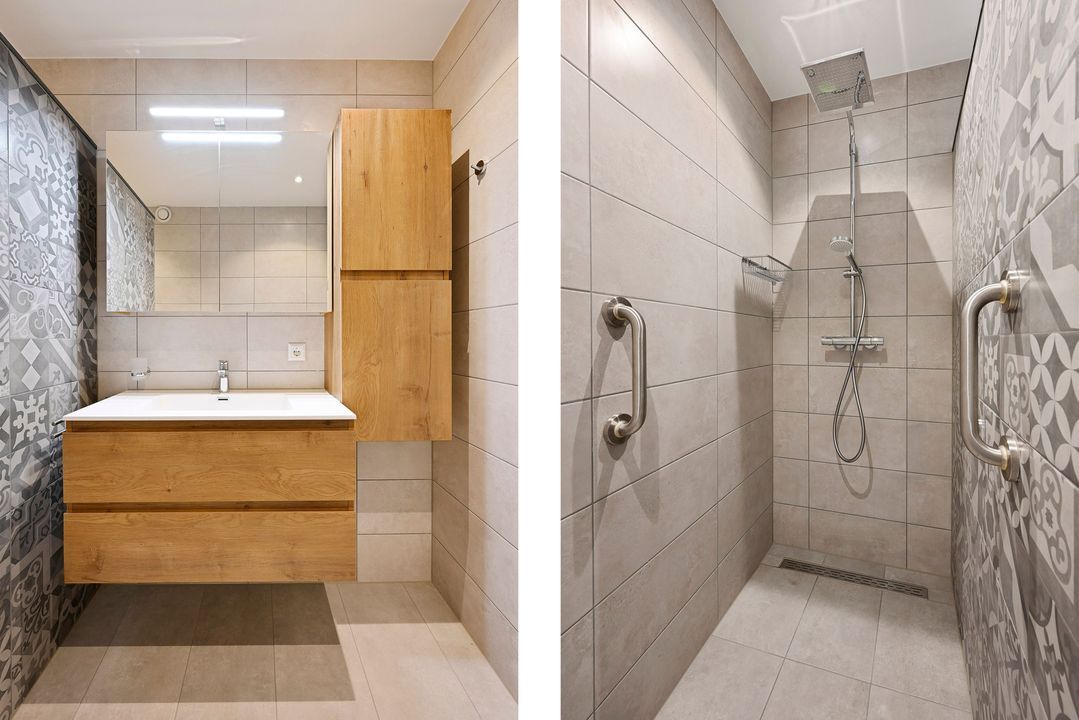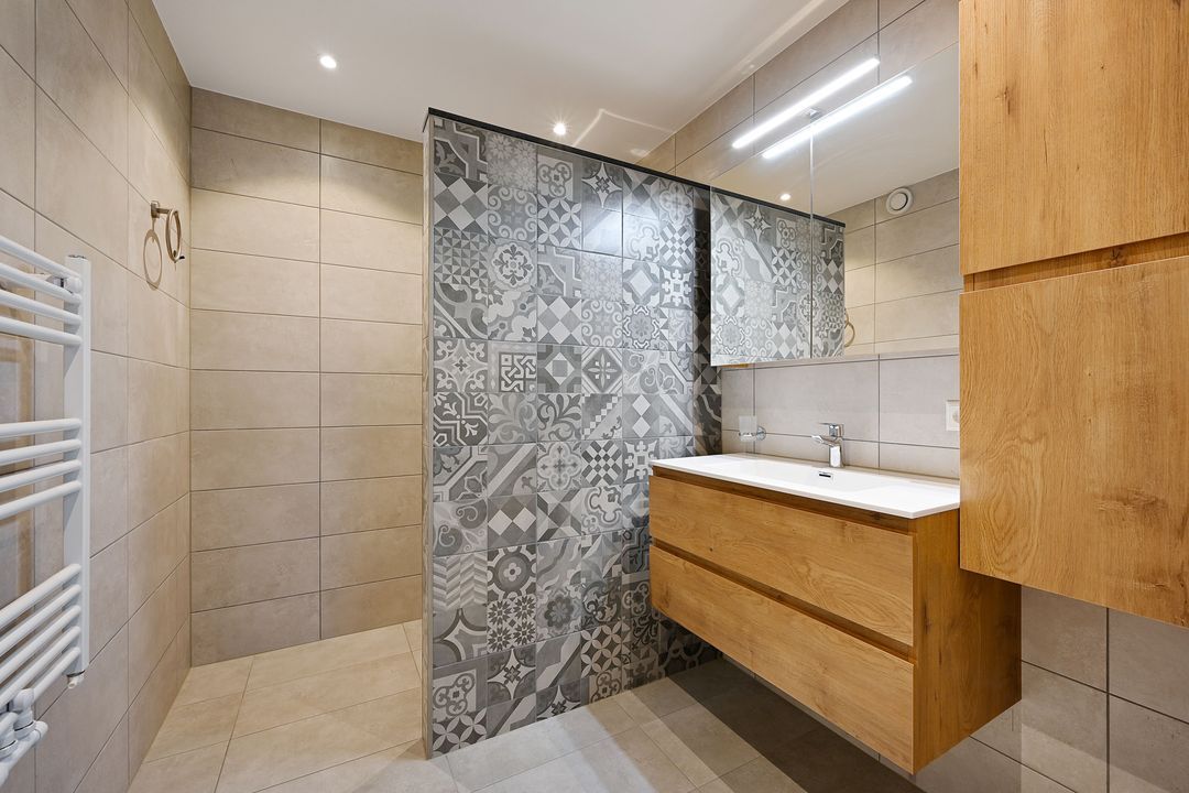 Recent vernieuwde, moderne badkamer met luxe uitstraling, voorzien van ruime inloopdouche, stijlvol tegelwerk, fraai wastafelmeubel en goed lichtplan.