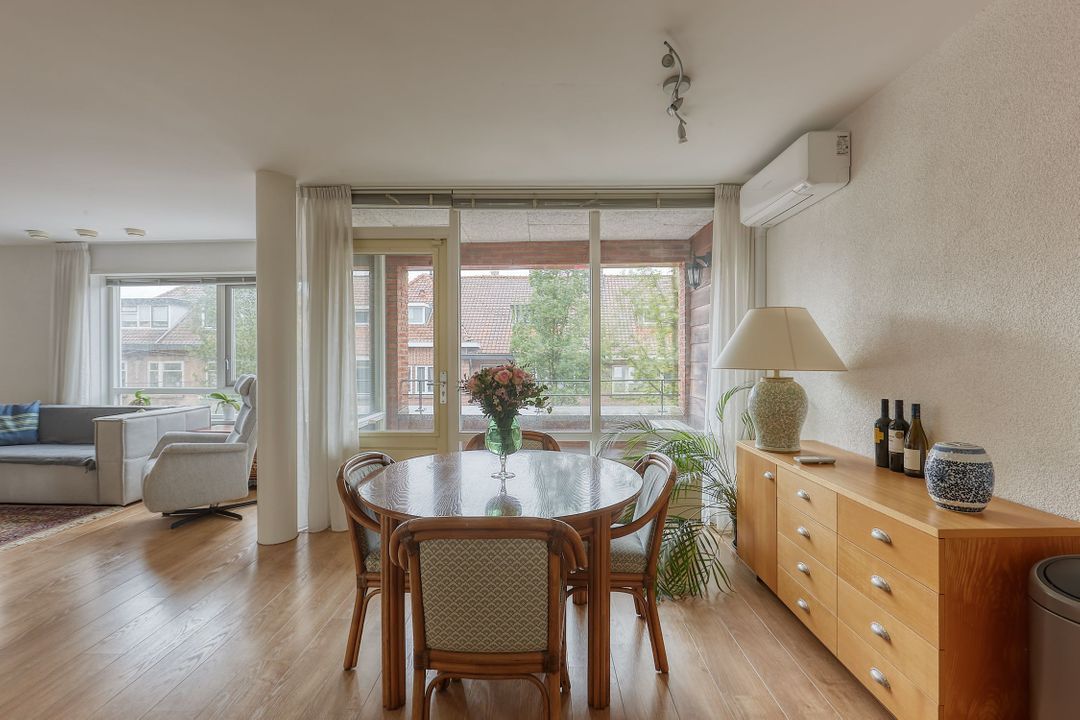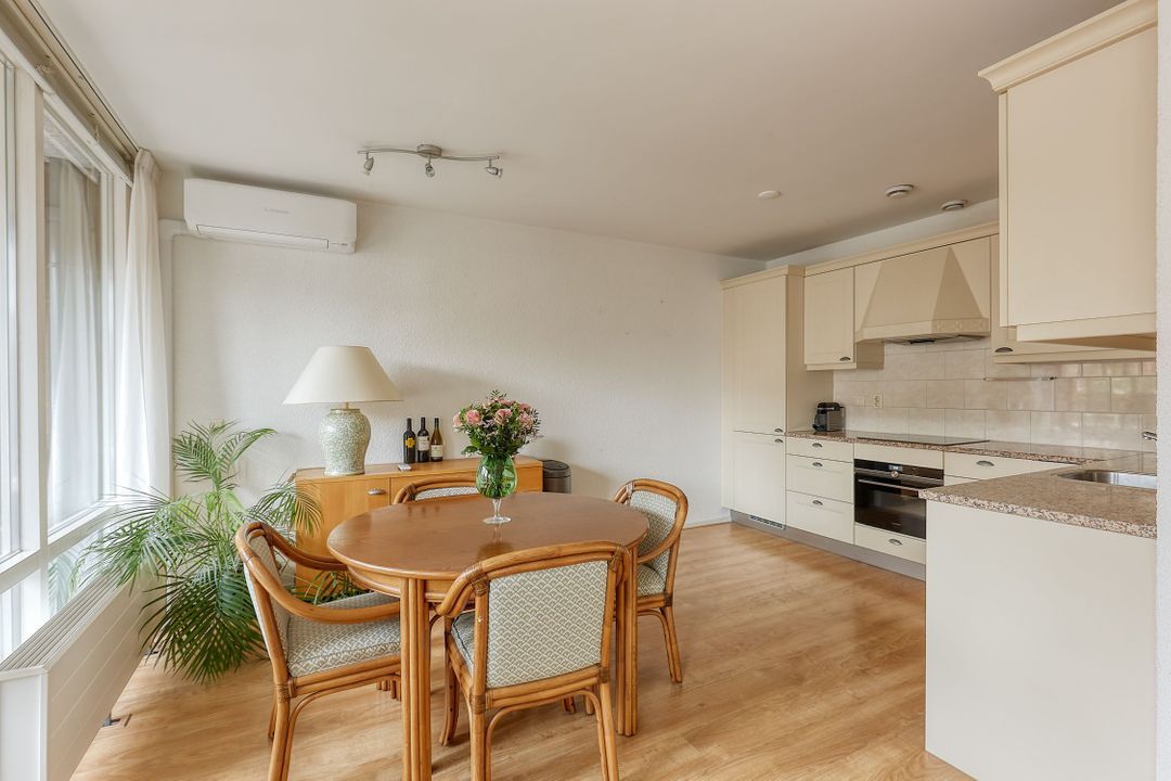 De badkamer, met een afmeting van ca. 2.61 x 2.62 meter, beschikt over een aparte inloopdouche, een wastafelmeubel, een radiator en een aansluiting voor wasmachine en droger. De lichte en royale woon-/eetkamer strekt zich uit over de volle breedte van het appartement (ca. 8.65 x 4.48 meter, deels 2.63 meter) en biedt toegang tot het zonnige terras op het zuidwesten, met een levendig uitzicht op de Damlaan. De luxe open keuken, in hoekopstelling (ca. 3.10 x 2.20 meter), is voorzien van een granieten aanrechtblad en diverse inbouwapparatuur, waaronder een vaatwasser, combi magnetron oven, afzuigkap, 4-pits inductiekookplaat en een koel-/vriescombinatie.
