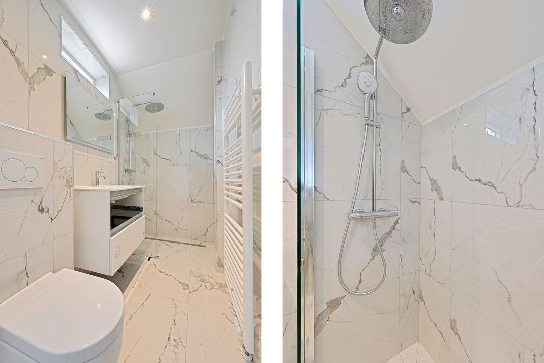 Separaat een tweede compleet vernieuwde badkamerruimte met 3e toilet, wastafelmeubel en een inloopdouche en handdoekradiator.