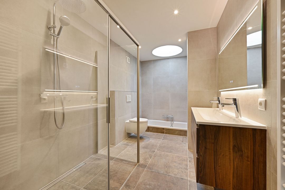 Vanuit de slaapkamer bereikt u de compleet vernieuwde modern en luxe uitgevoerde badkamerruimte met inloopdouche en een dubbel wastafelmeubel, 2e toilet, handdoekradiator en een verdiept aangelegd ligbad, boven het ligbad is een lichtkoepel voor een mooie lichtinval in de badkamer.
