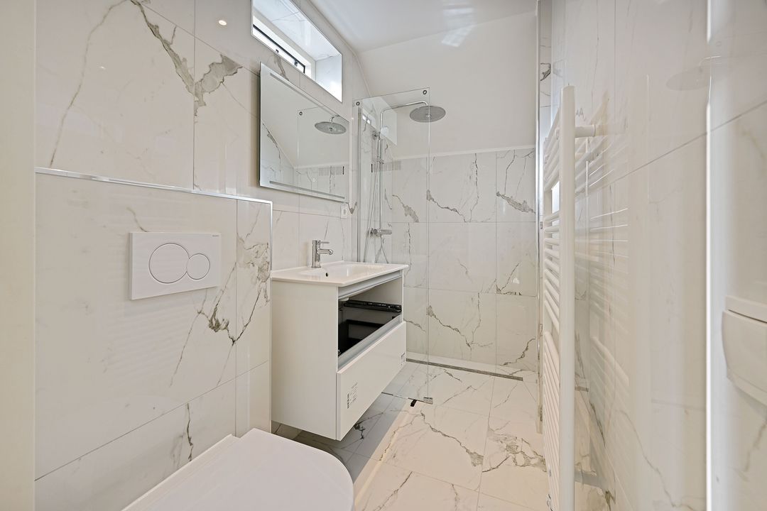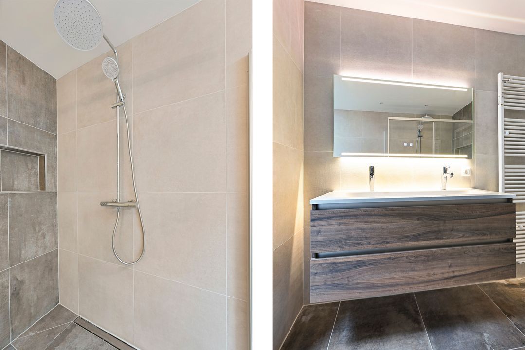 Separaat een tweede compleet vernieuwde badkamerruimte met 3e toilet, wastafelmeubel en een inloopdouche en handdoekradiator.
