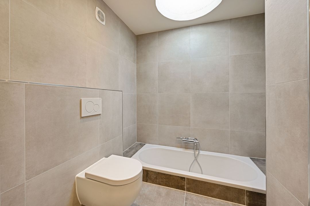 Vanuit de slaapkamer bereikt u de compleet vernieuwde modern en luxe uitgevoerde badkamerruimte met inloopdouche en een dubbel wastafelmeubel, 2e toilet, handdoekradiator en een verdiept aangelegd ligbad, boven het ligbad is een lichtkoepel voor een mooie lichtinval in de badkamer.