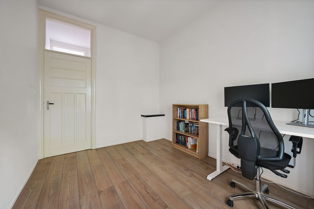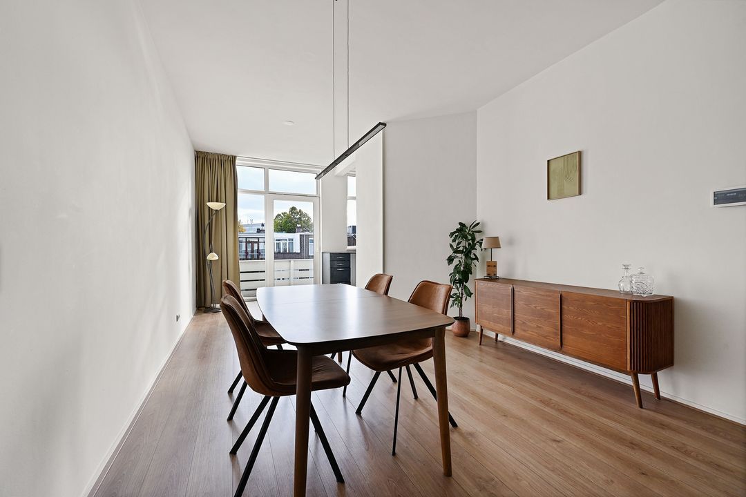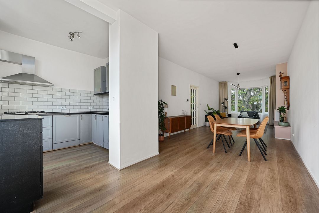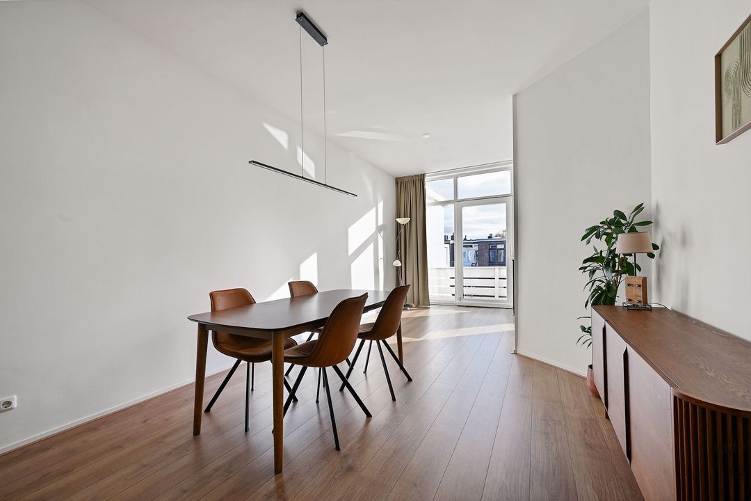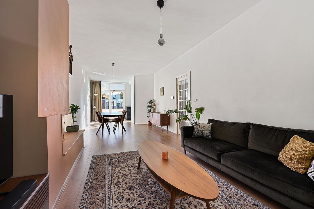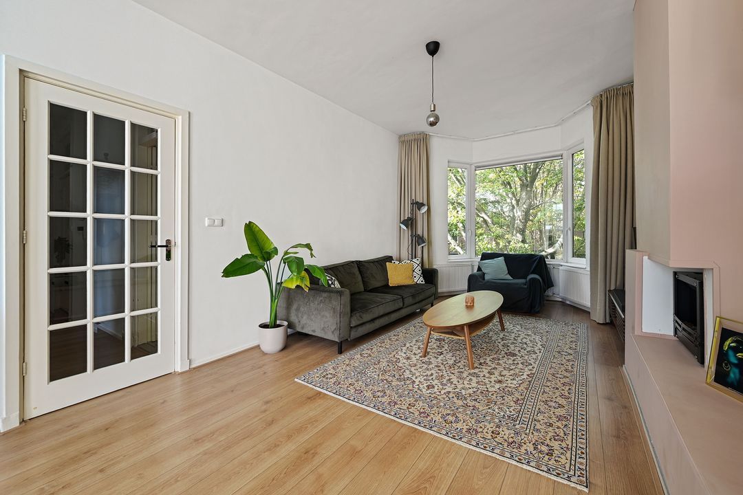De royale woon-eetkamer van ca. 11.87 x 3.49 heeft een charmante erker aan de voorzijde en een moderne, grote pui aan de achterzijde. Op de plek van de originele haard is een elektrische haard ingebouwd.