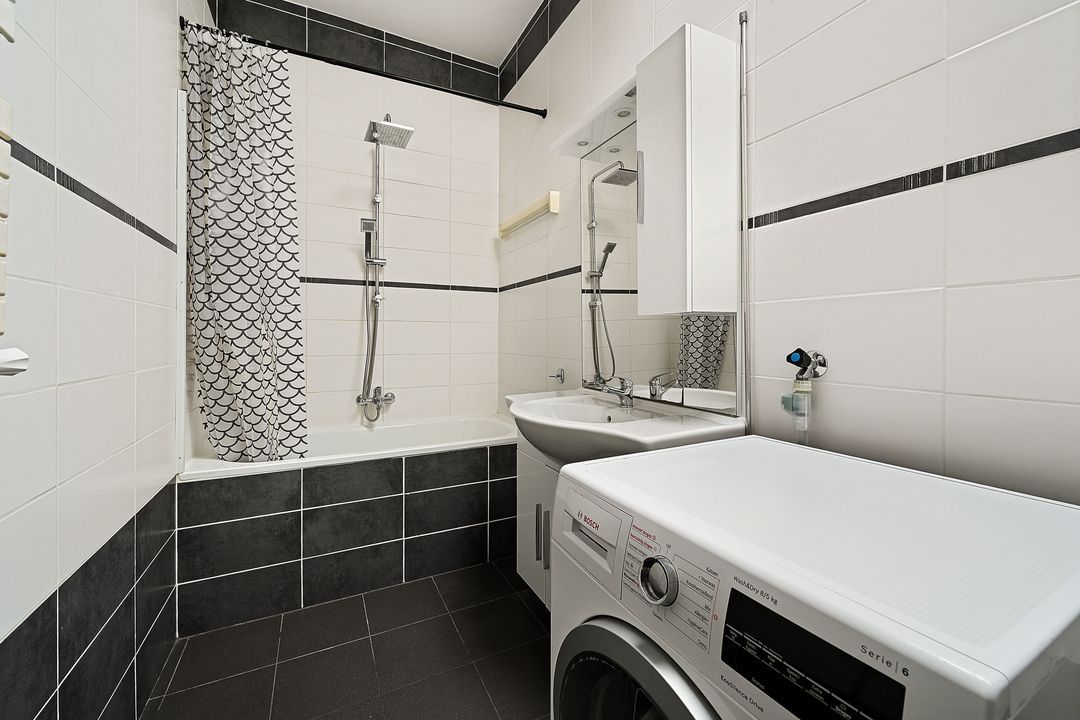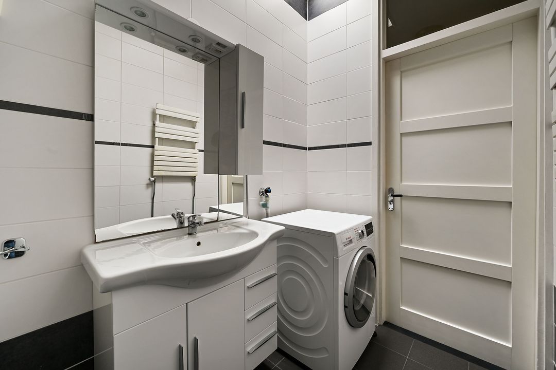 De moderne badkamer beschikt over een douche/ligbad combinatie, wastafelmeubel, radiator en wasmachine aansluiting. Het dakraam zorgt ervoor dat er ook in de badkamer natuurlijk licht binnenkomt.