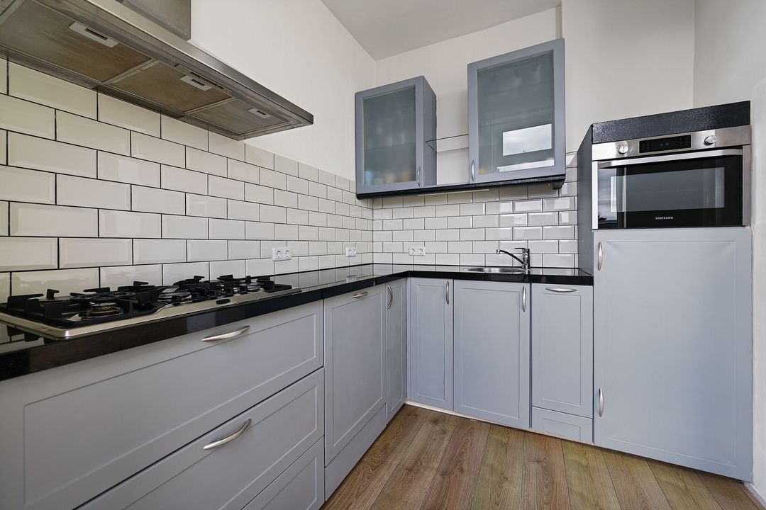 De open keuken aan de achterzijde staat in een L-opstelling en is voorzien van inbouw apparatuur zoals een 5-pits gaskookplaat, afzuigkap, vaatwasser en een combi oven/magnetron en koelkast.