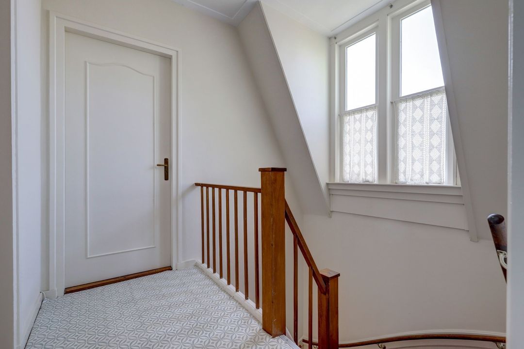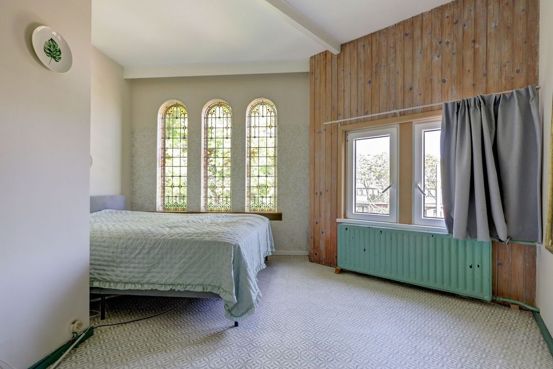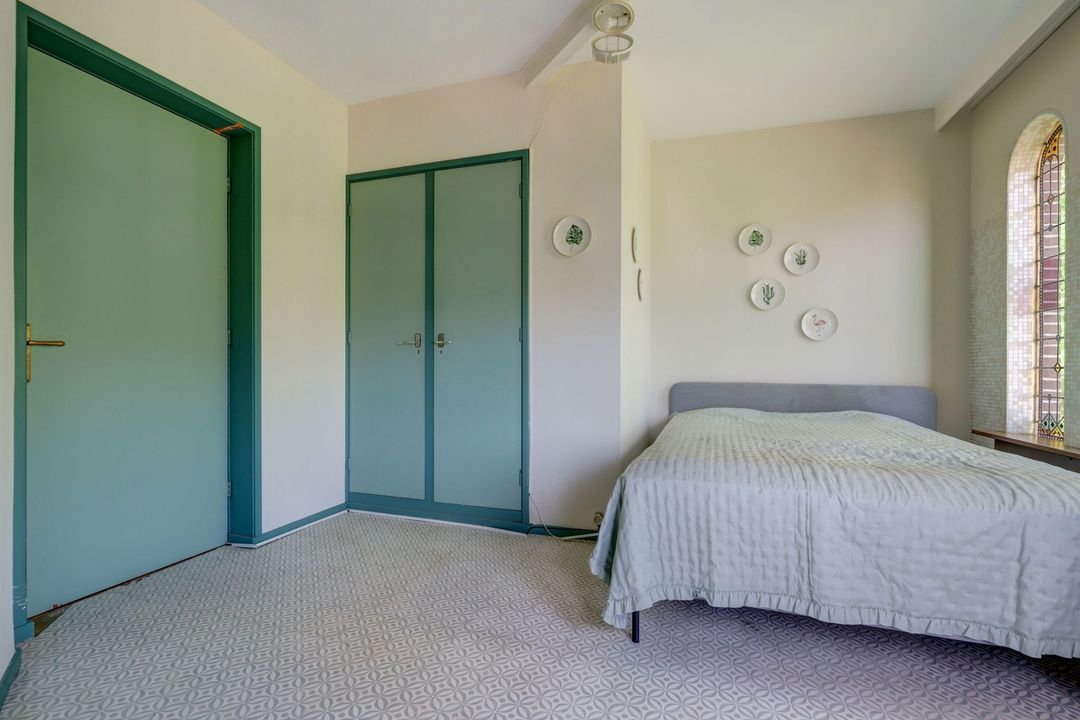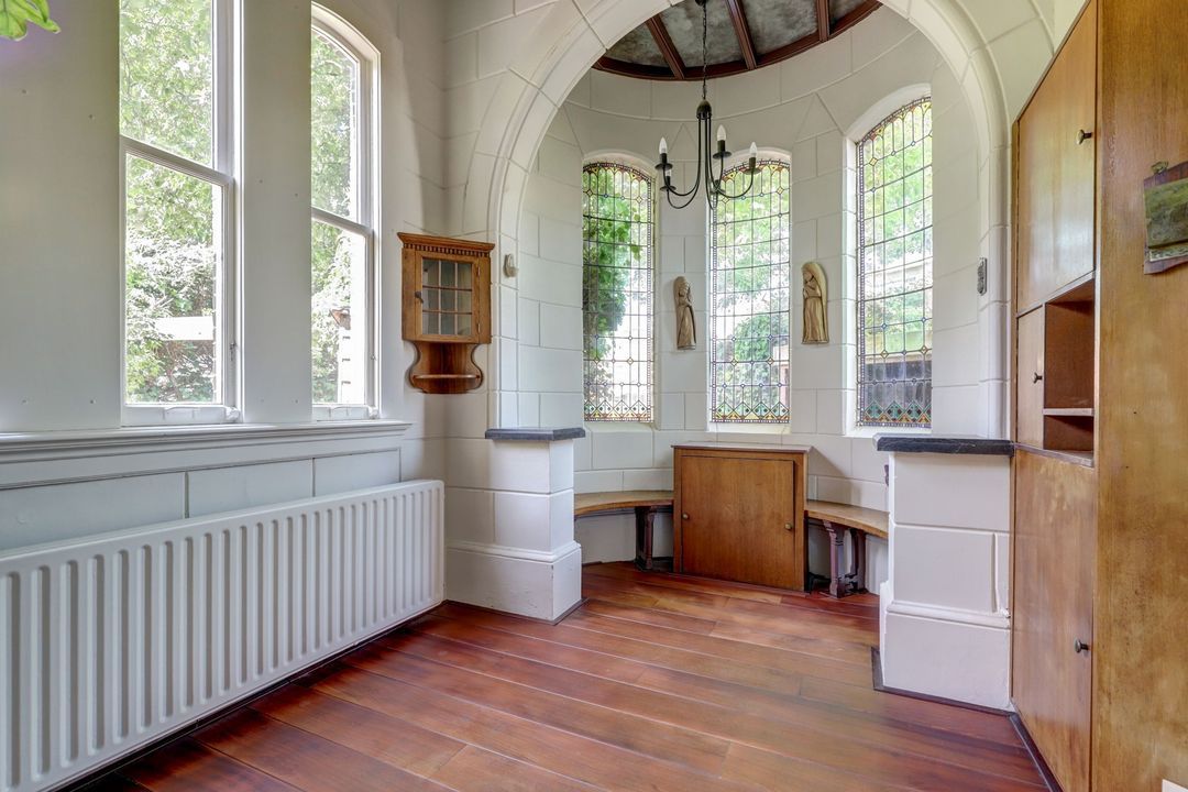 Bovenin de villa ontvouwt zich nog meer leefruimte. De torenkamer, met prachtig glas-in-lood en vaste kasten, is een van de meest bijzondere vertrekken van het huis: een inspirerende plek om te werken of simpelweg van het uitzicht te genieten.