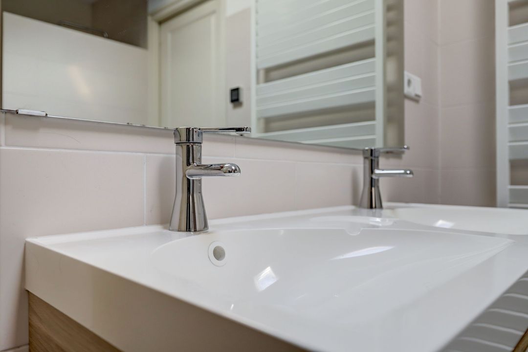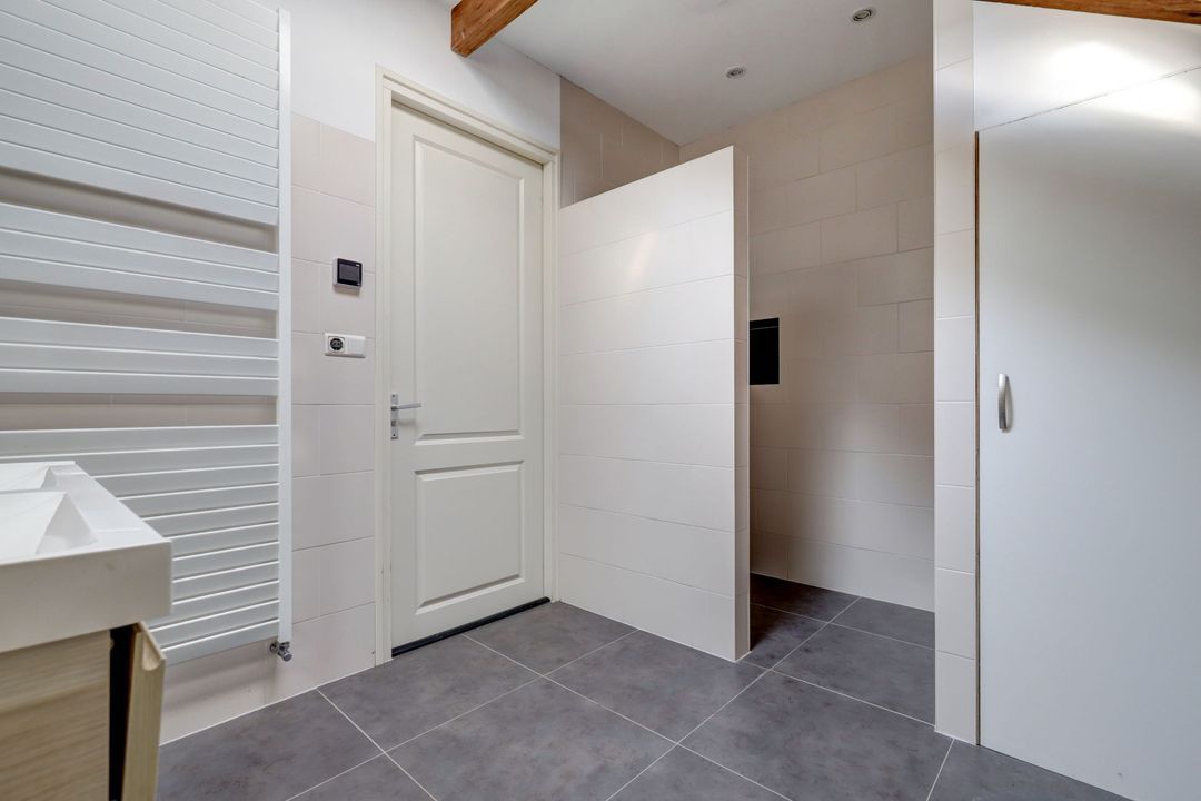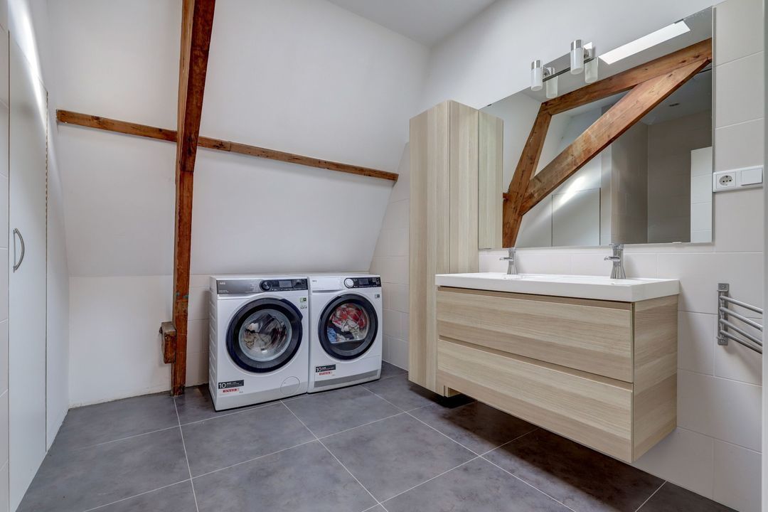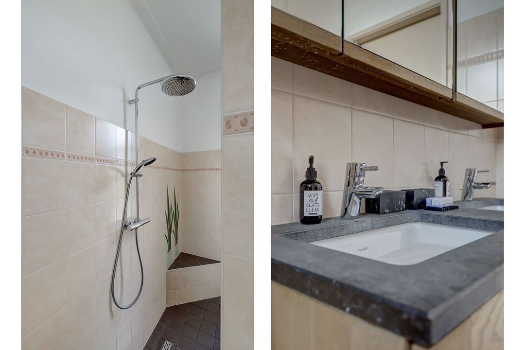 De badkamer is luxe, met scheepsdekvloer, massief eiken meubel met dubbele wastafels en een royale inloopregendouche. Daarnaast is er een separaat toilet.