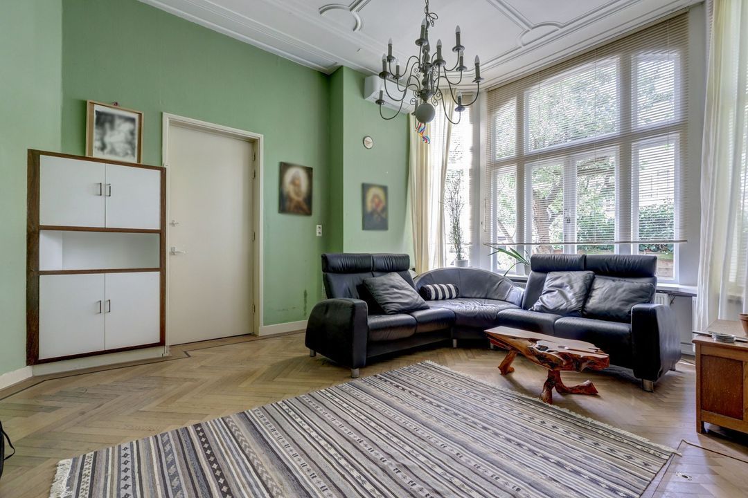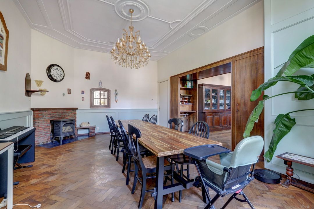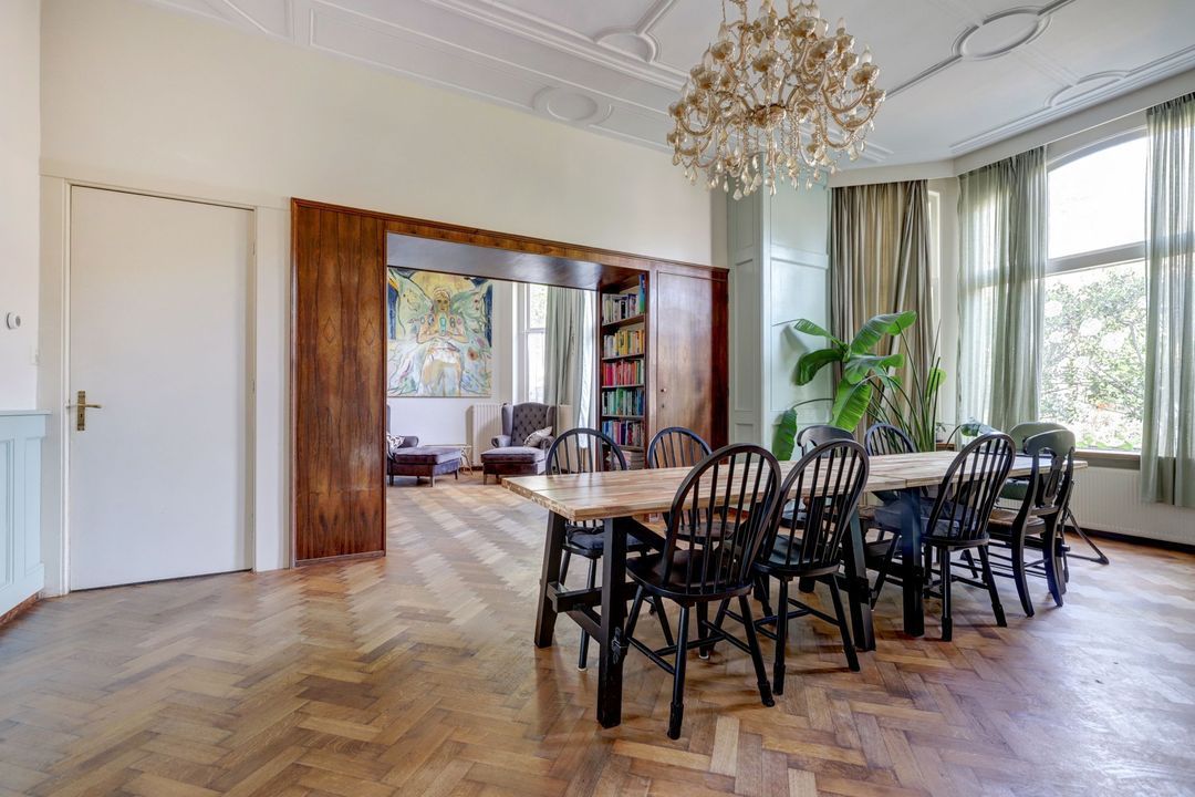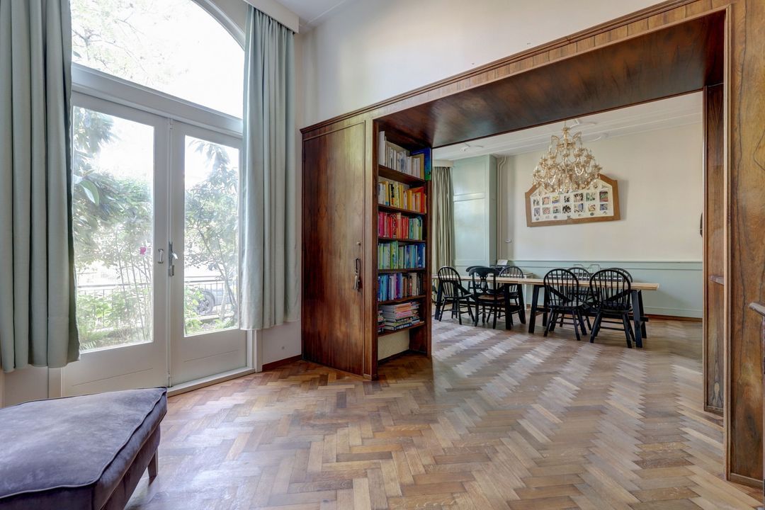 Aan de voorzijde ligt de voormalige wachtkamer, nu een lichte ruimte met glas-in-loodramen: perfect als werkkamer of bibliotheek. Vanuit de centrale gang loopt u door naar de ruime woonkamer. Hier vloeien leef- en eetgedeelte in elkaar over, omlijst door een massieve parketvloer, een sfeervolle haard en Jugendstil-plafonds met sierlijke ornamenten. De maatvoering en de lichtinval geven dit vertrek een zeldzaam gevoel van ruimte en elegantie.