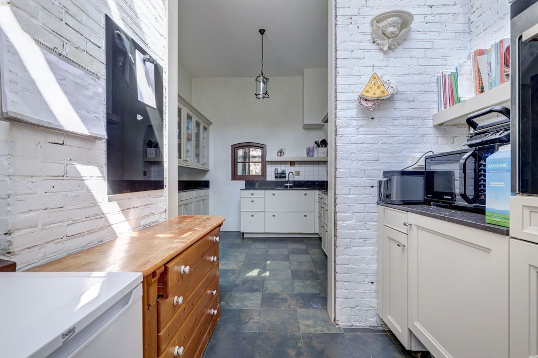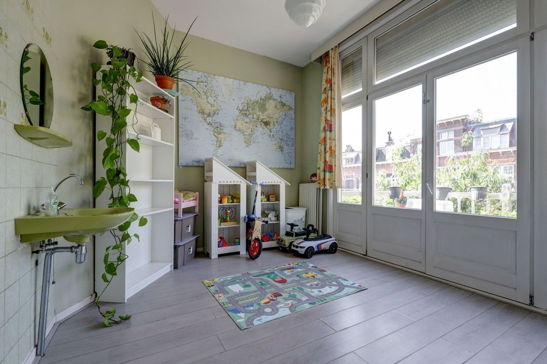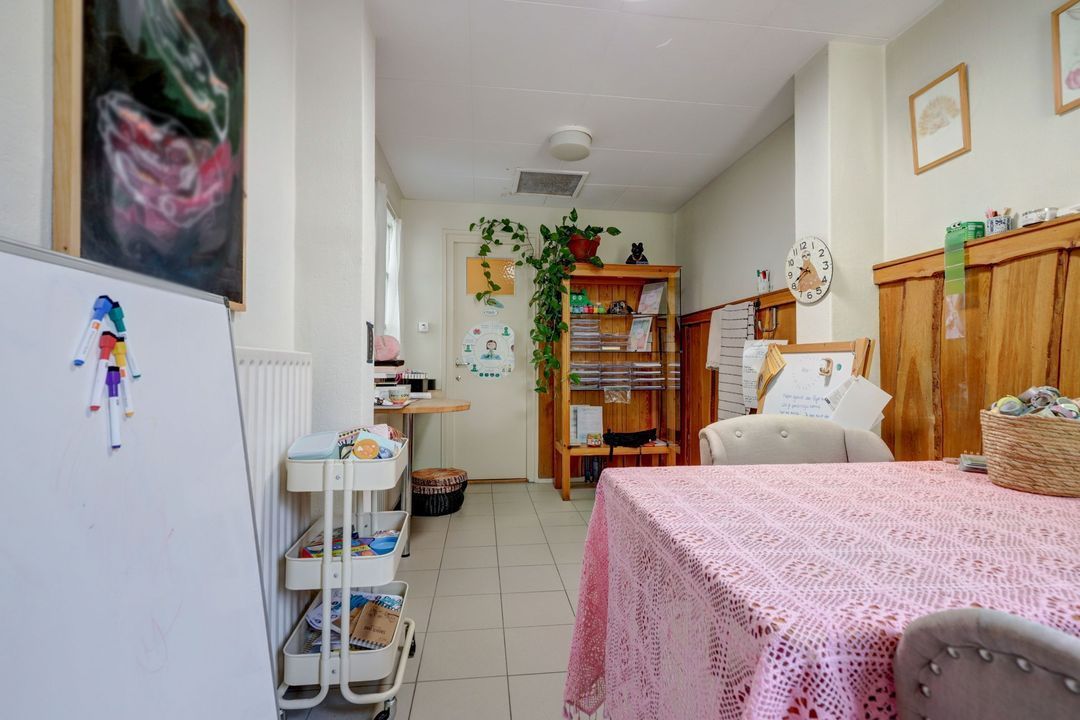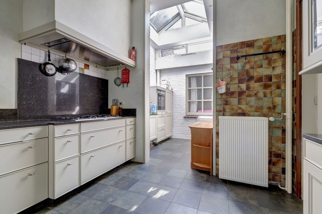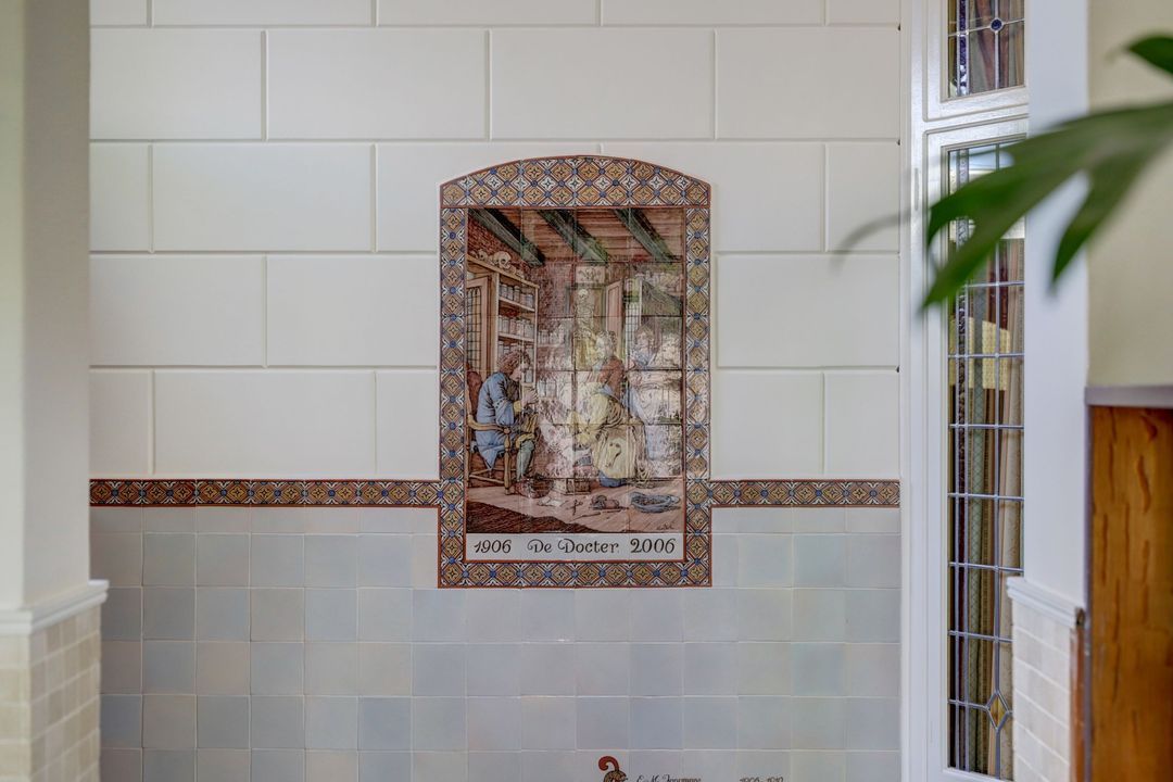 Aan de voorzijde ligt de voormalige wachtkamer, nu een lichte ruimte met glas-in-loodramen: perfect als werkkamer of bibliotheek. Vanuit de centrale gang loopt u door naar de ruime woonkamer. Hier vloeien leef- en eetgedeelte in elkaar over, omlijst door een massieve parketvloer, een sfeervolle haard en Jugendstil-plafonds met sierlijke ornamenten. De maatvoering en de lichtinval geven dit vertrek een zeldzaam gevoel van ruimte en elegantie.