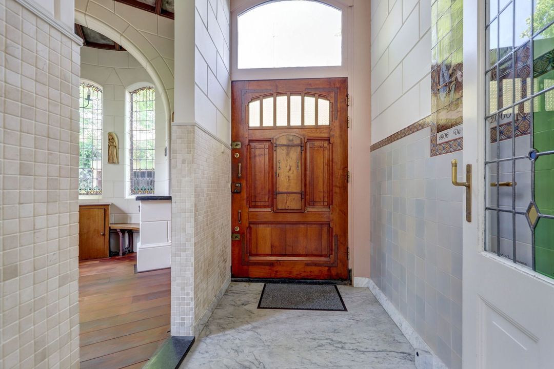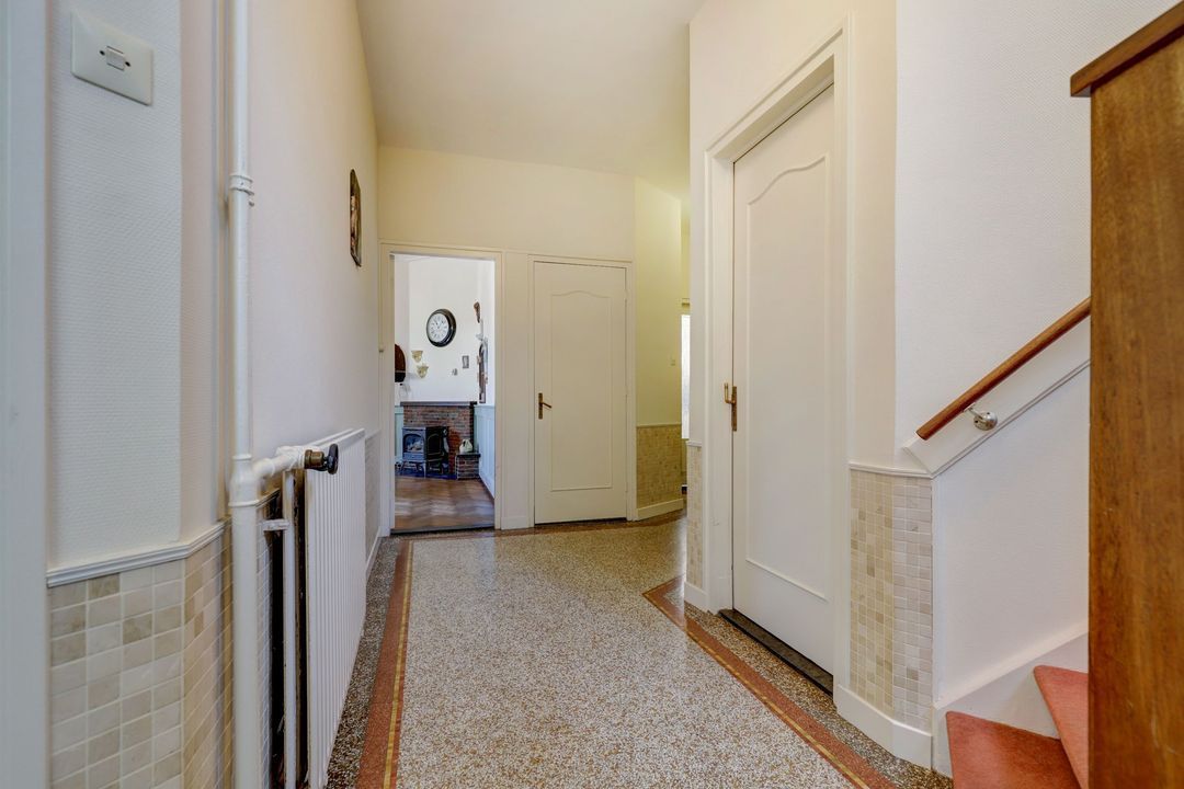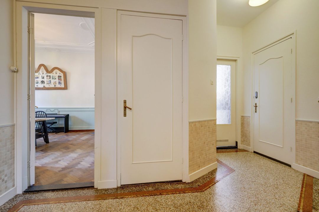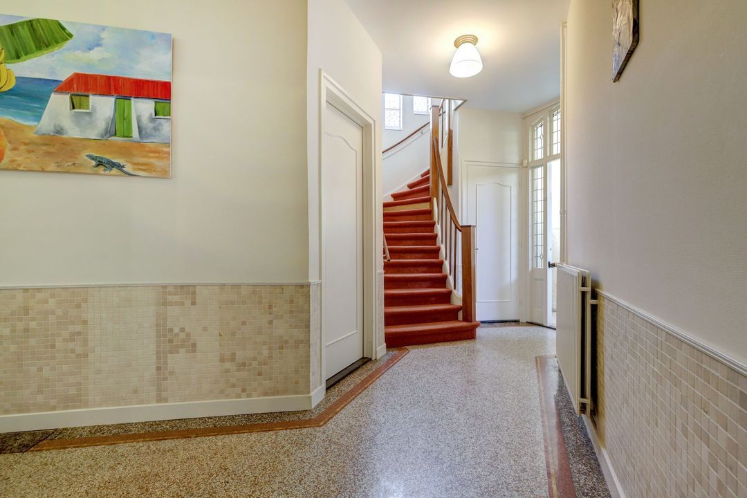 Wie de voortuin betreedt – met eigen parkeergelegenheid voor 2 auto's- ervaart meteen de allure van dit huis. De monumentale voordeur opent naar een vestibule met originele marmer/granitovloer en kleurrijk mozaïek. Het daglicht speelt door de glas-in-loodramen.