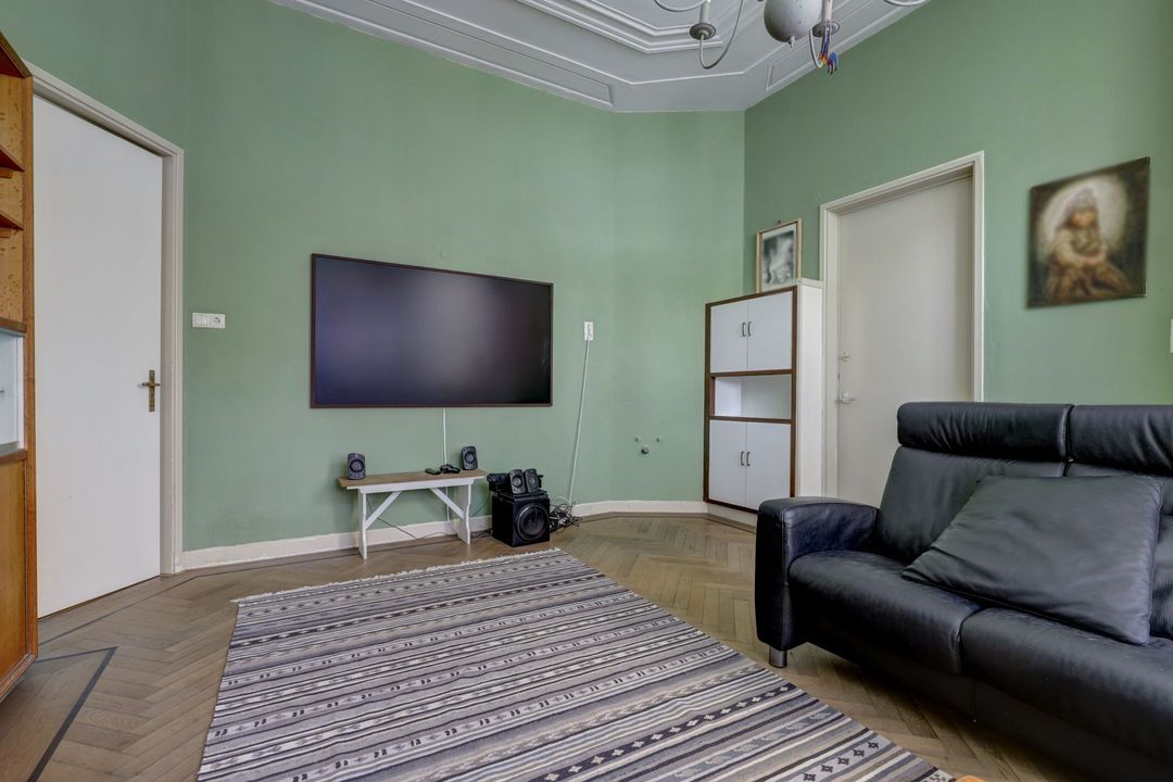 At the front of the house, the former waiting room has been transformed into a bright and versatile space with stained-glass windows, ideal as a home office or library. From the central hallway, you enter the spacious living room, where the sitting and dining areas flow seamlessly together. This elegant space is enhanced by a solid parquet floor, a charming fireplace, and Jugendstil ceilings adorned with decorative ornaments. The generous proportions and natural light create a rare sense of openness and sophistication.