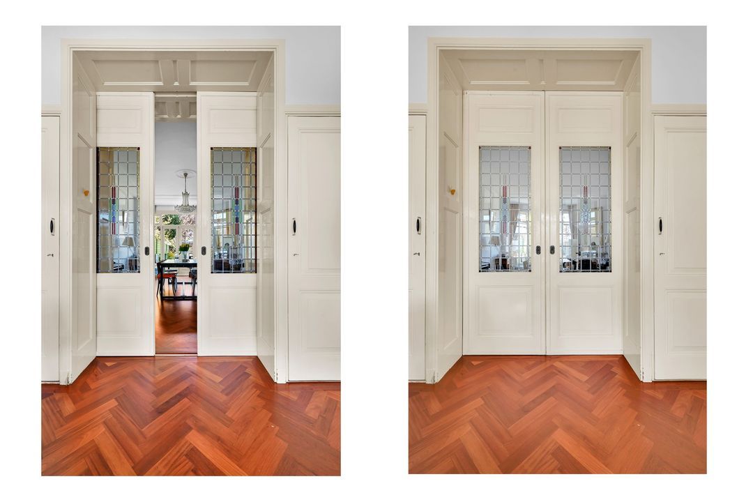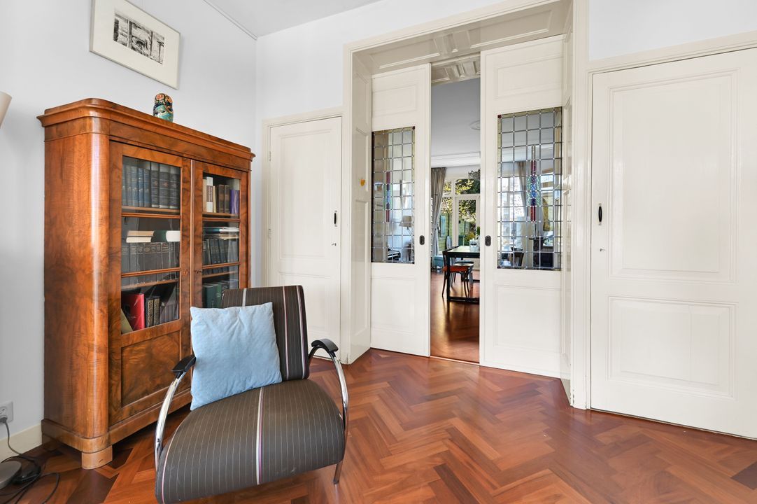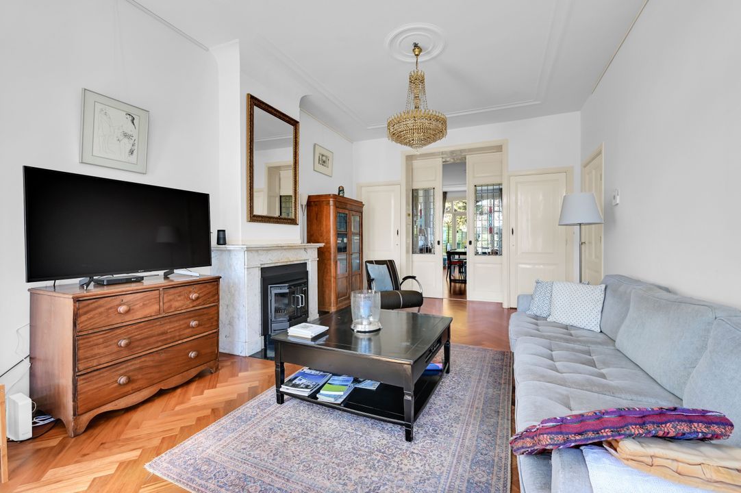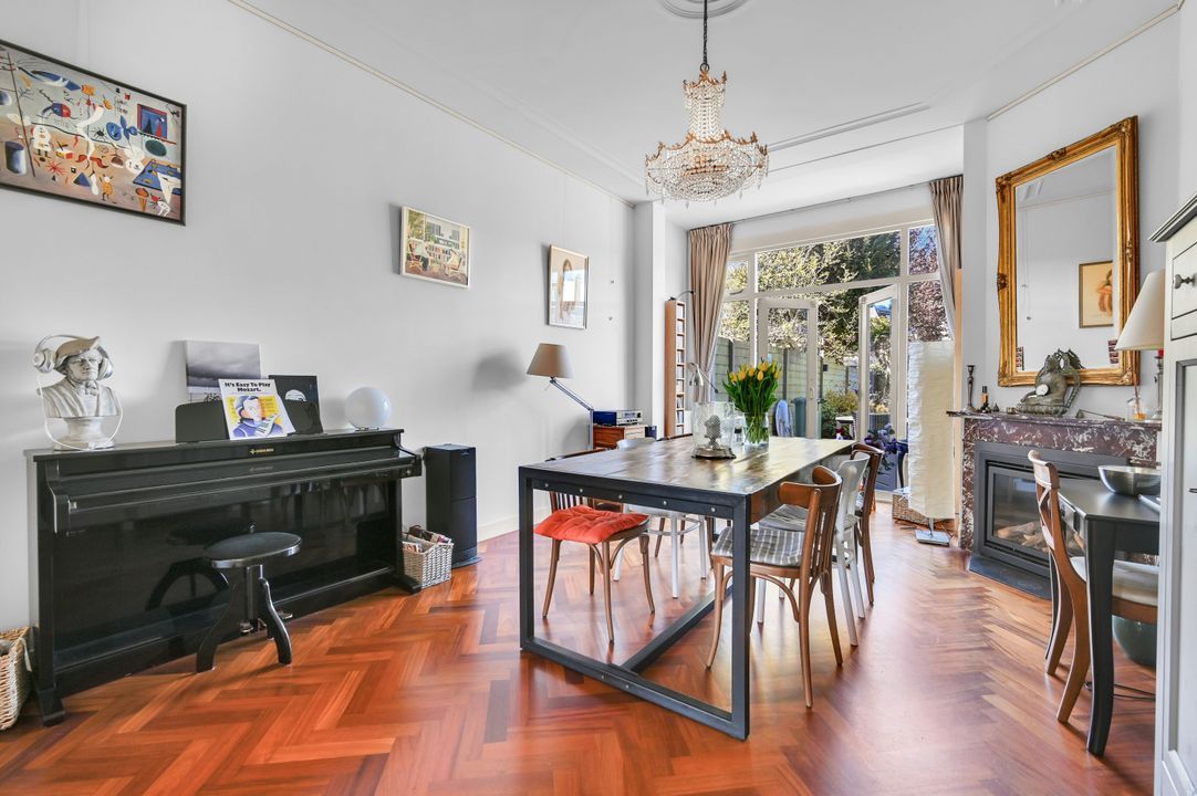 The ground floor consists of a spacious en-suite living room. The original sliding doors with built-in cupboards separate the rooms. At the front is the sitting room. The rear room is perfectly suited as a dining room and enjoys views of, as well as direct access to, the deep back garden. The separate kitchen is also located at the rear and likewise provides access to the garden. This layout also offers excellent opportunities to enlarge the living space, for example by adding an extension with an open-plan kitchen.