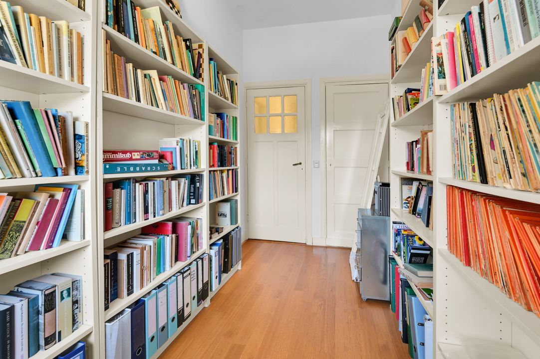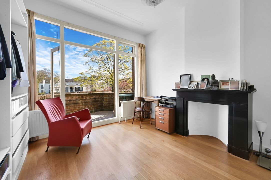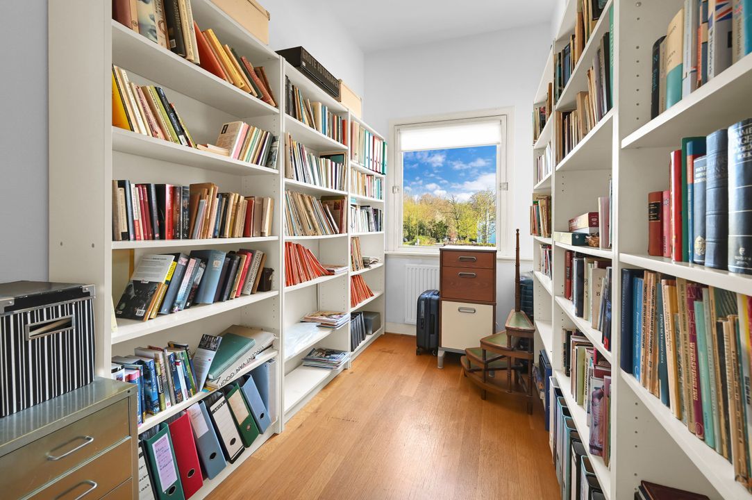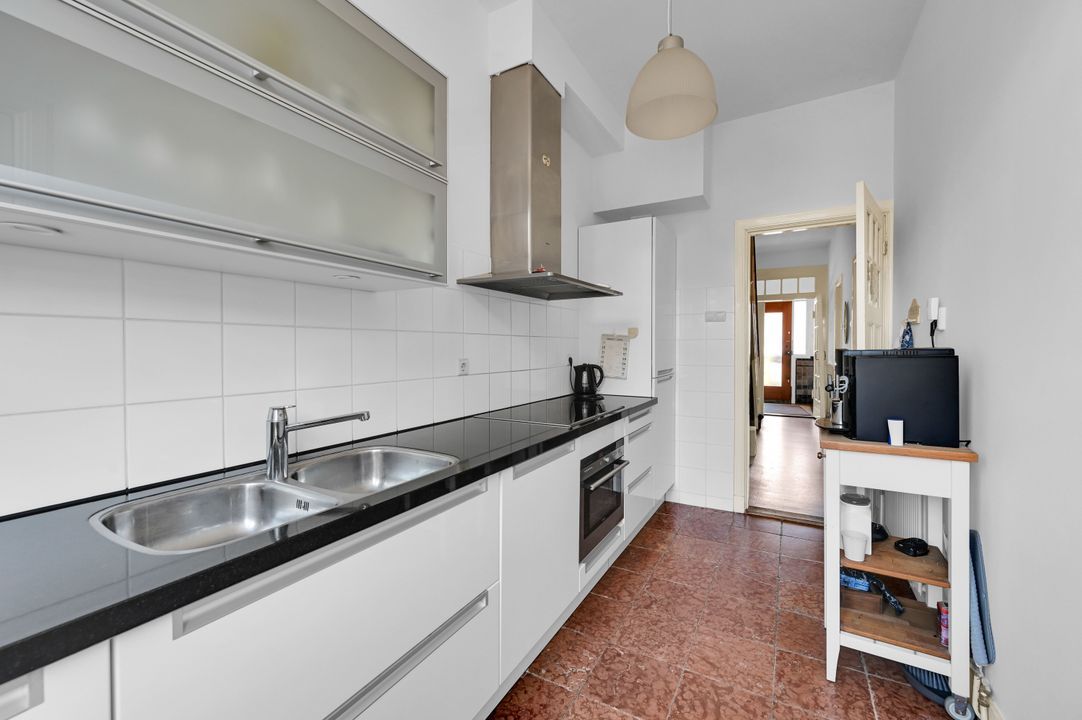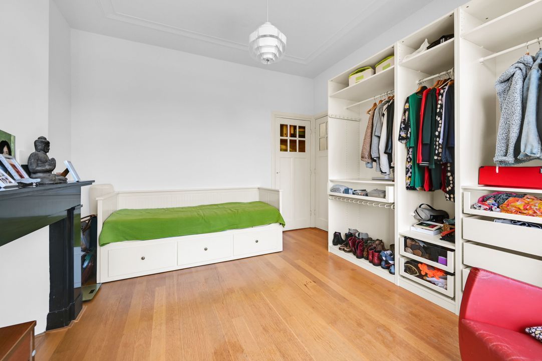 The ground floor consists of a spacious en-suite living room. The original sliding doors with built-in cupboards separate the rooms. At the front is the sitting room. The rear room is perfectly suited as a dining room and enjoys views of, as well as direct access to, the deep back garden. The separate kitchen is also located at the rear and likewise provides access to the garden. This layout also offers excellent opportunities to enlarge the living space, for example by adding an extension with an open-plan kitchen.