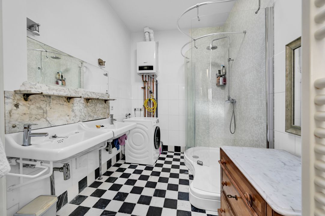 On the first floor, the landing provides access to four bedrooms, a bathroom, and a separate toilet. At the front is a spacious bedroom with access to the balcony. Also at the front is a second, more compact room, ideal as a study or children’s bedroom. The bathroom is centrally located and fitted with a shower and two sinks. At the rear are two further bedrooms, one of which also has access to a balcony.