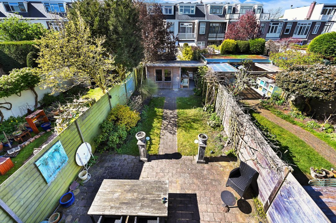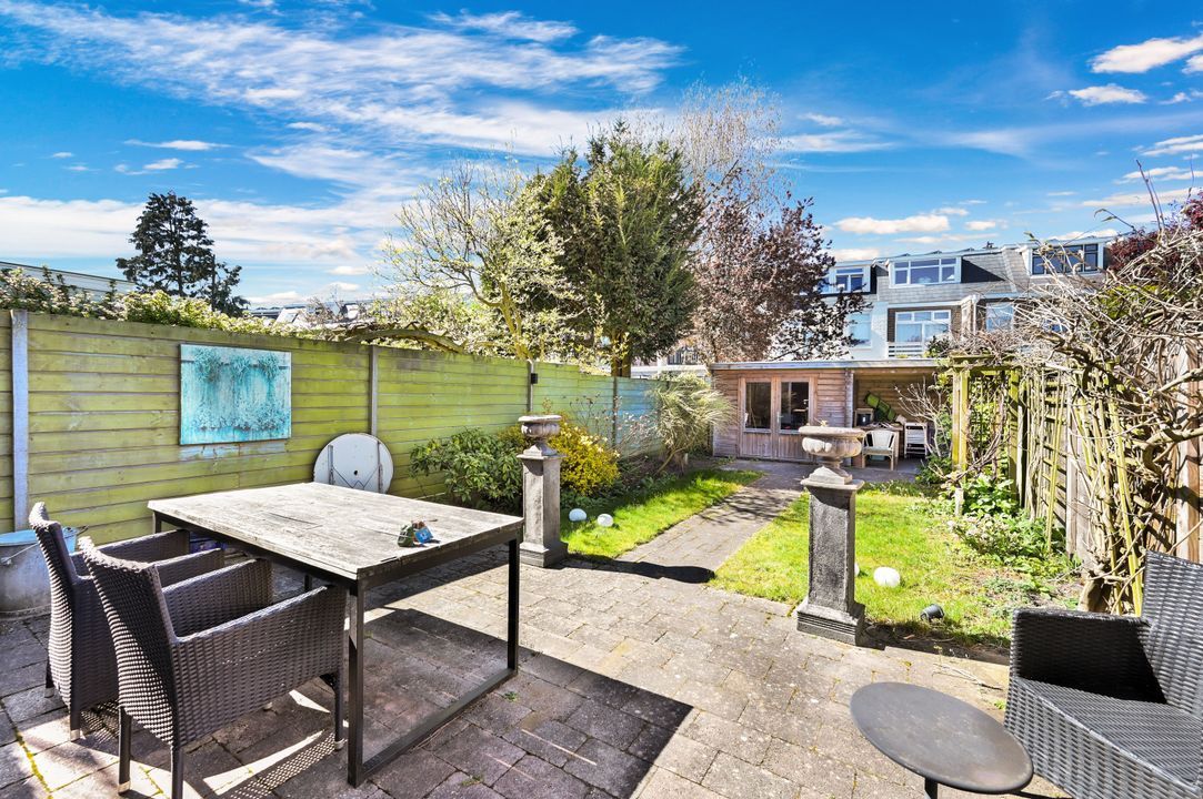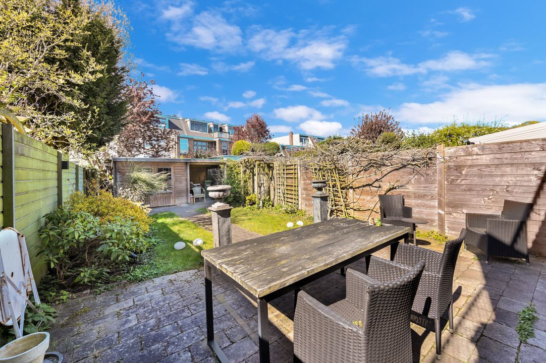 Aan de achterzijde ligt de bijna 17 meter diepe achtertuin met volop zonuren en meer dan genoeg ruimte. Achterin staan een berging en een overkapping. Ideaal voor opslag en om beschut buiten te zitten.