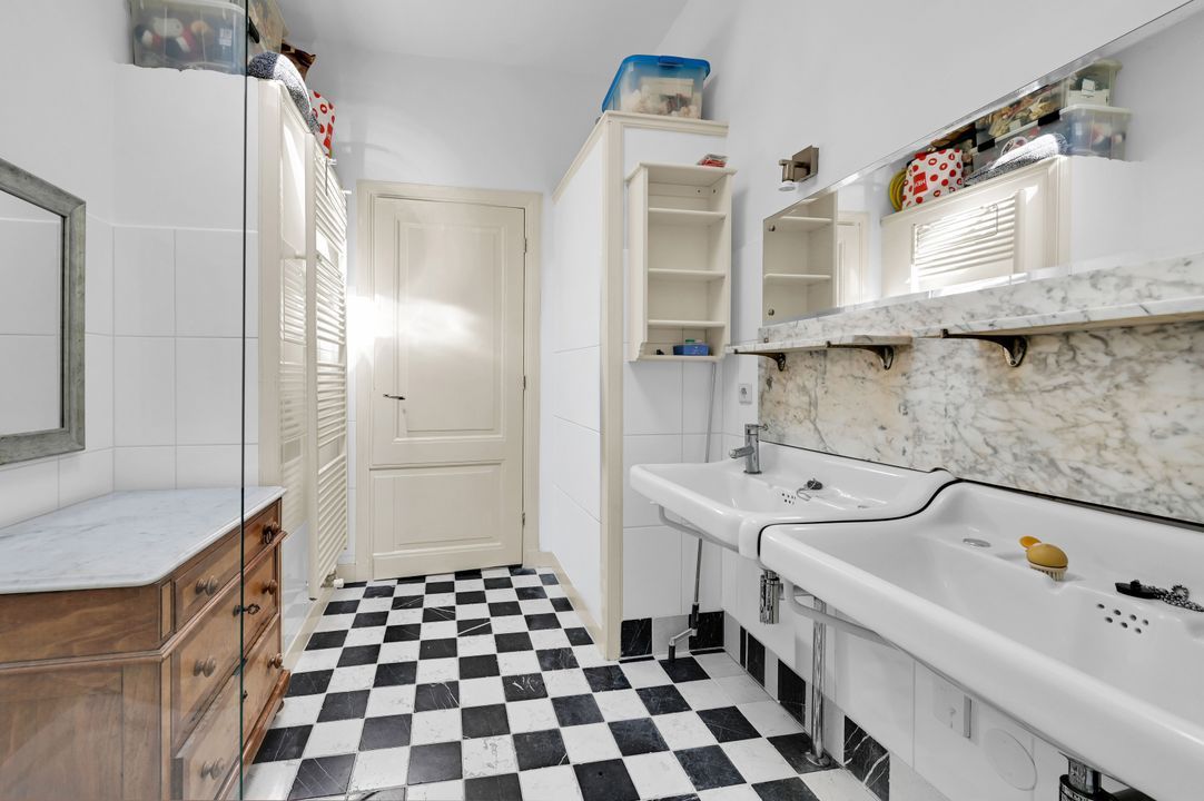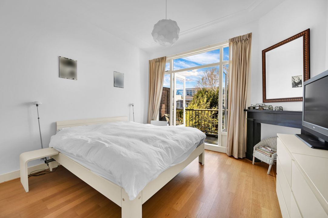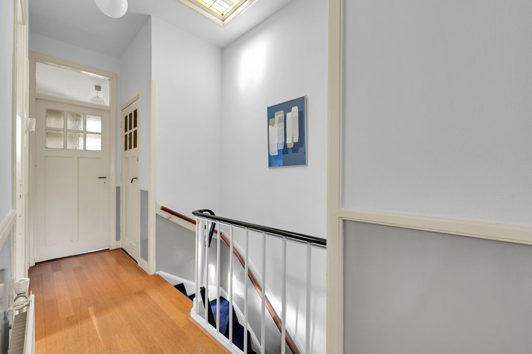 Op de eerste verdieping geeft de overloop toegang tot vier slaapkamers, een badkamer en een separaat toilet. Aan de voorzijde ligt een ruime slaapkamer met toegang tot het balkon. Daarnaast ligt aan de voorzijde een tweede, compactere kamer. Deze is goed te gebruiken als werk- of kinderkamer. De badkamer ligt centraal en is voorzien van een douche en dubbele wastafel. Aan de achterzijde bevinden zich nog twee slaapkamers, waarvan één eveneens toegang heeft tot een balkon.