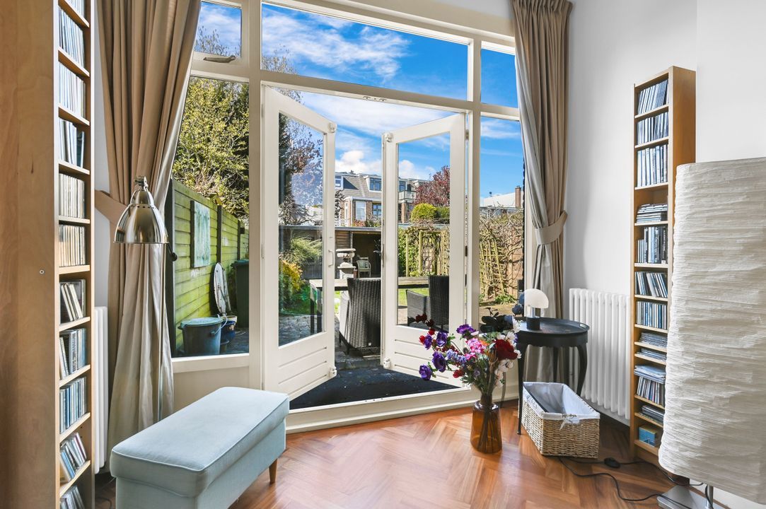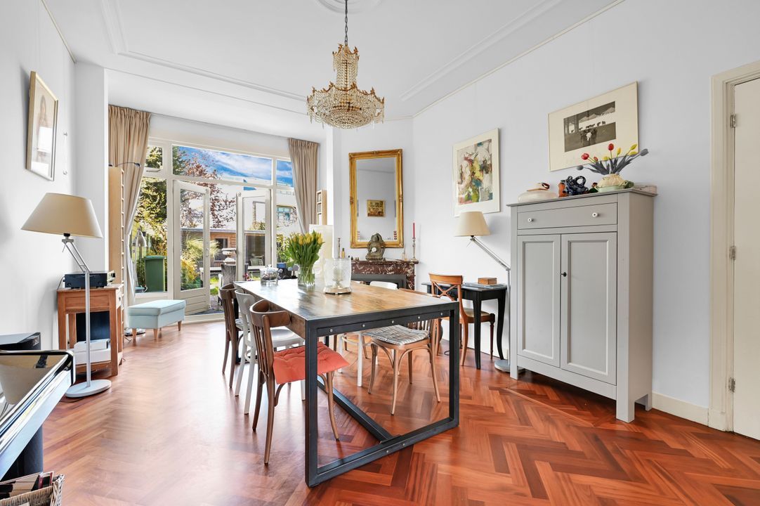 De begane grond bestaat uit een ruime woonkamer en suite. De originele schuifdeuren met vaste kasten scheiden de ruimtes van elkaar. Aan de voorzijde bevindt zich de zitkamer. De achterkamer is uitstekend geschikt als eetkamer en heeft zicht op én directe toegang tot de diepe achtertuin. De gesloten keuken ligt eveneens aan de achterzijde en biedt ook toegang tot de tuin. Deze indeling biedt bovendien mooie kansen om de leefruimte te vergroten. Denk bijvoorbeeld aan een aanbouw met een open woonkeuken.