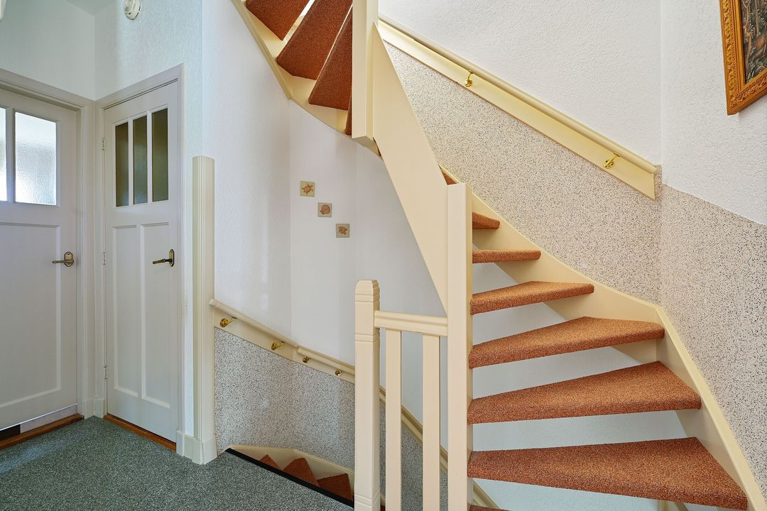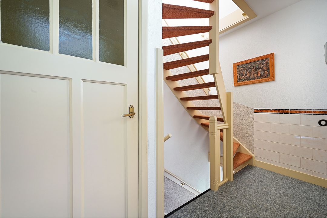 Verder een ruime voorraadkast. Oorspronkelijk hebben deze woningen een middentrap, maar de trap is verplaatst naar de zijkant waardoor op de zolder een betere indeling is gerealiseerd!.