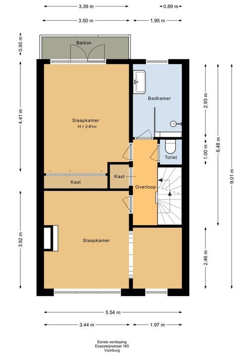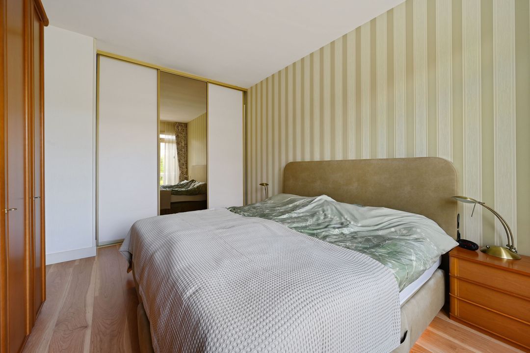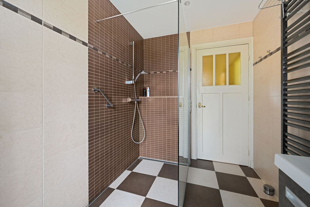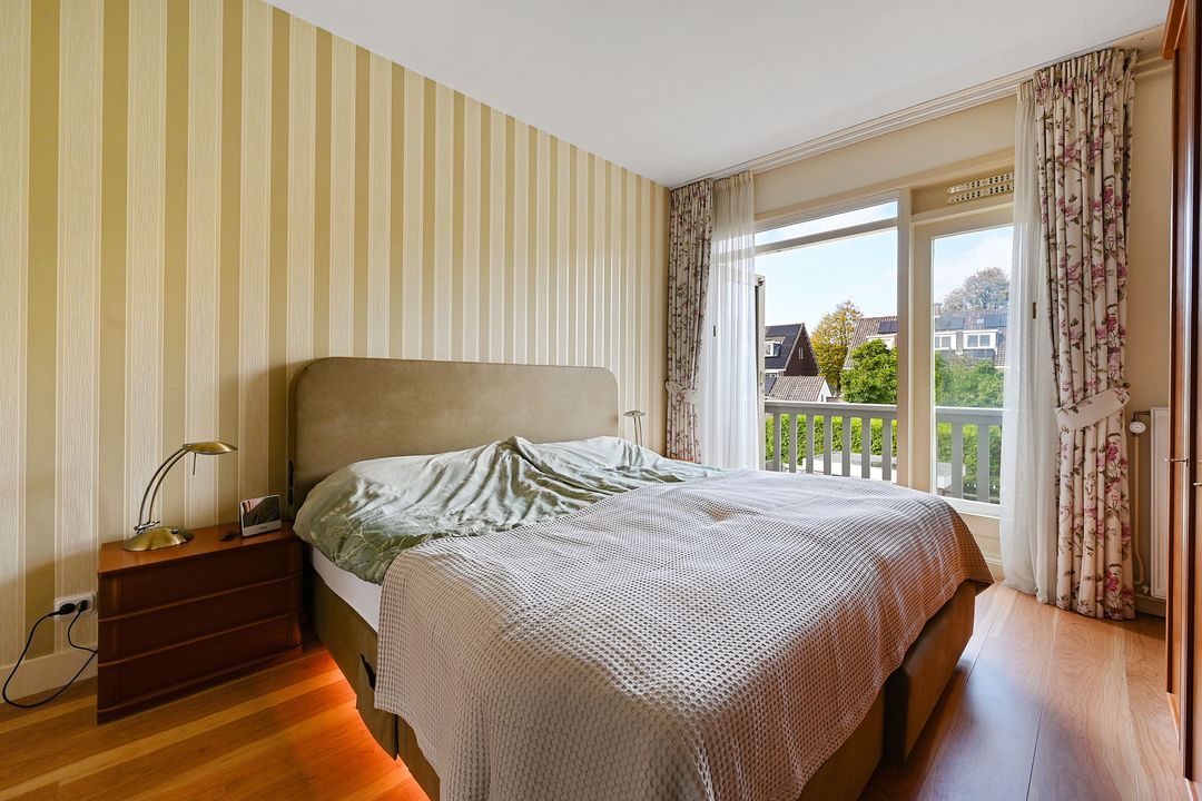 Overloop naar een modern betegelde badkamer (2013) aan de achterzijde met een wastafelmeubel, een aparte douche, een 2e apart hangend toilet en een handdoekradiator. Grote slaapkamer aan de achterzijde ca. 4.41 x 3.50. Dubbele openslaande deuren naar het balkon aan de achterzijde. Slaapkamer aan de voorzijde ca. 3.92 x 3.44/5.54 met bijgetrokken voorzijkamer.