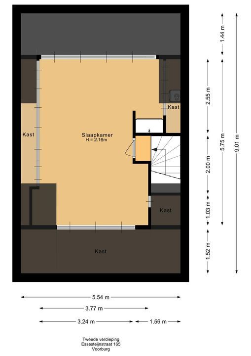 overloop, toegang tot een grote zolderetage met aan beide zijden een ruime dakkapel zodat hier een grote kamer is ontstaan van ca. 5.75 x 3.77 (deze maten zijn gemeten op ca. 1.50 hoogte en exclusief de diepte van de vaste kasten). Tevens de CV-opstelplaats op de zolderetage.