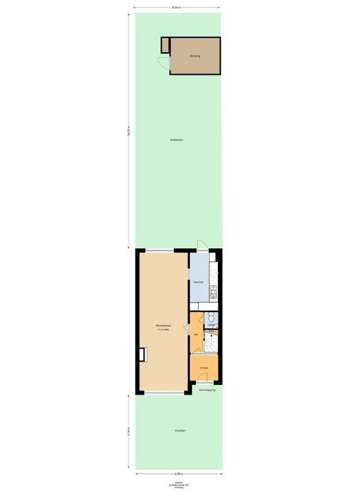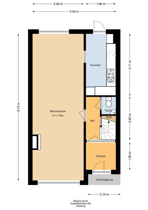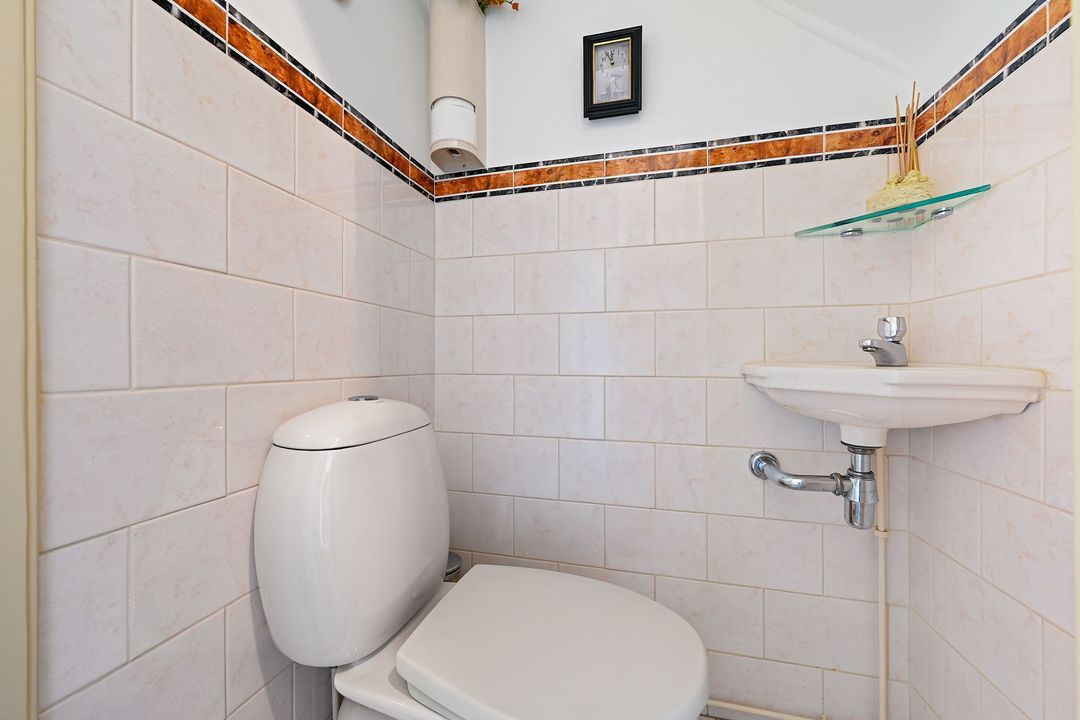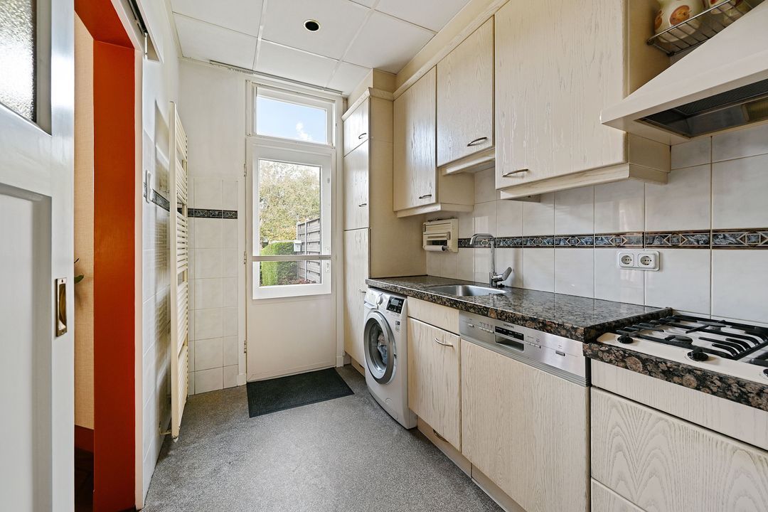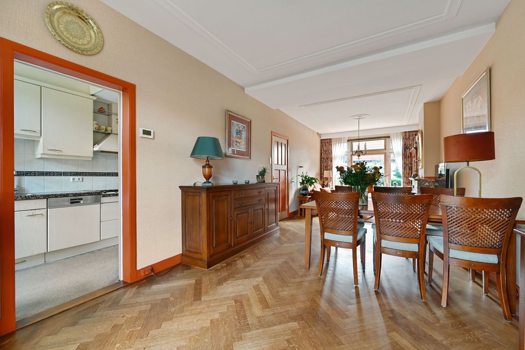 ruime voortuin (ca. 6 meter diep), entree woning. Vestibule met meterkast. Deur met glas in raam naar de hal. Modern betegelde toiletruimte met toilet en fontein. Lichte woon-eetkamer ca. 9.72 X 3.38 met een fraaie houten vloer. Doorloop naar de keuken ca. 4.11 x 1.96 aan de achterzijde in een L-opstelling. De keuken is voorzien van diverse inbouwapparatuur en heeft een granieten werkblad.