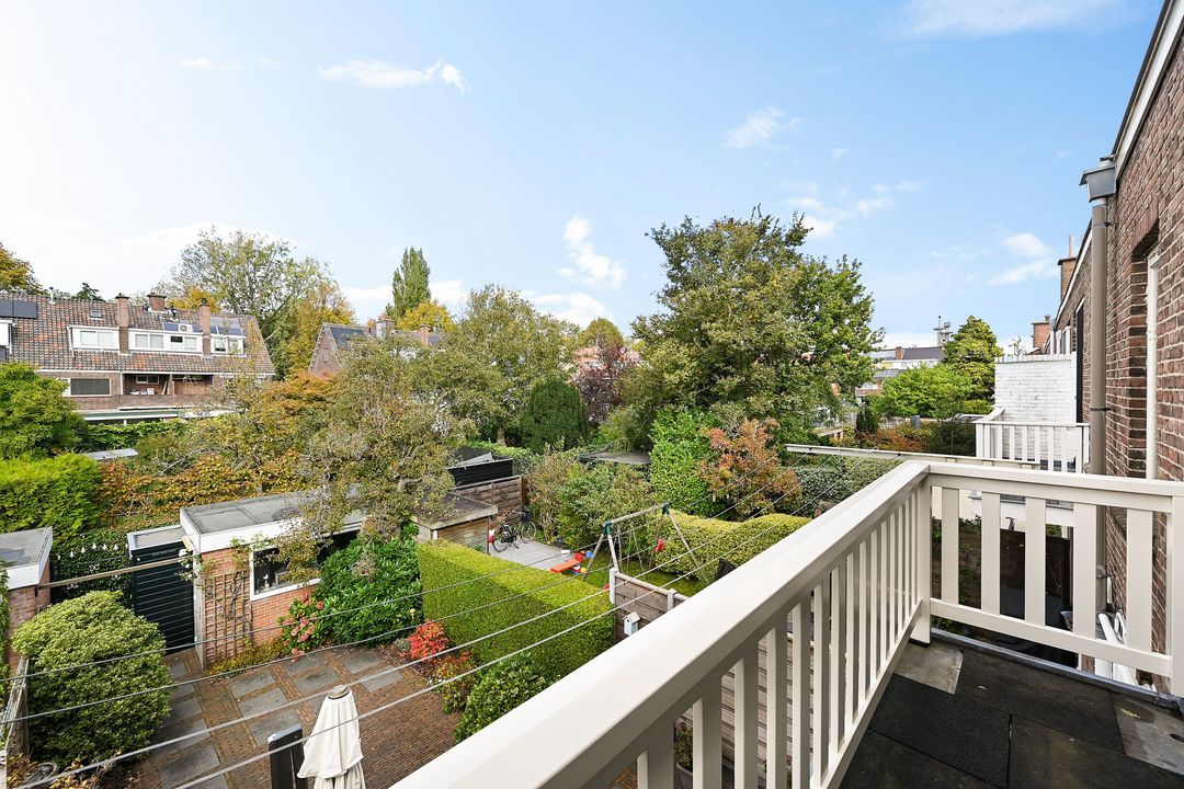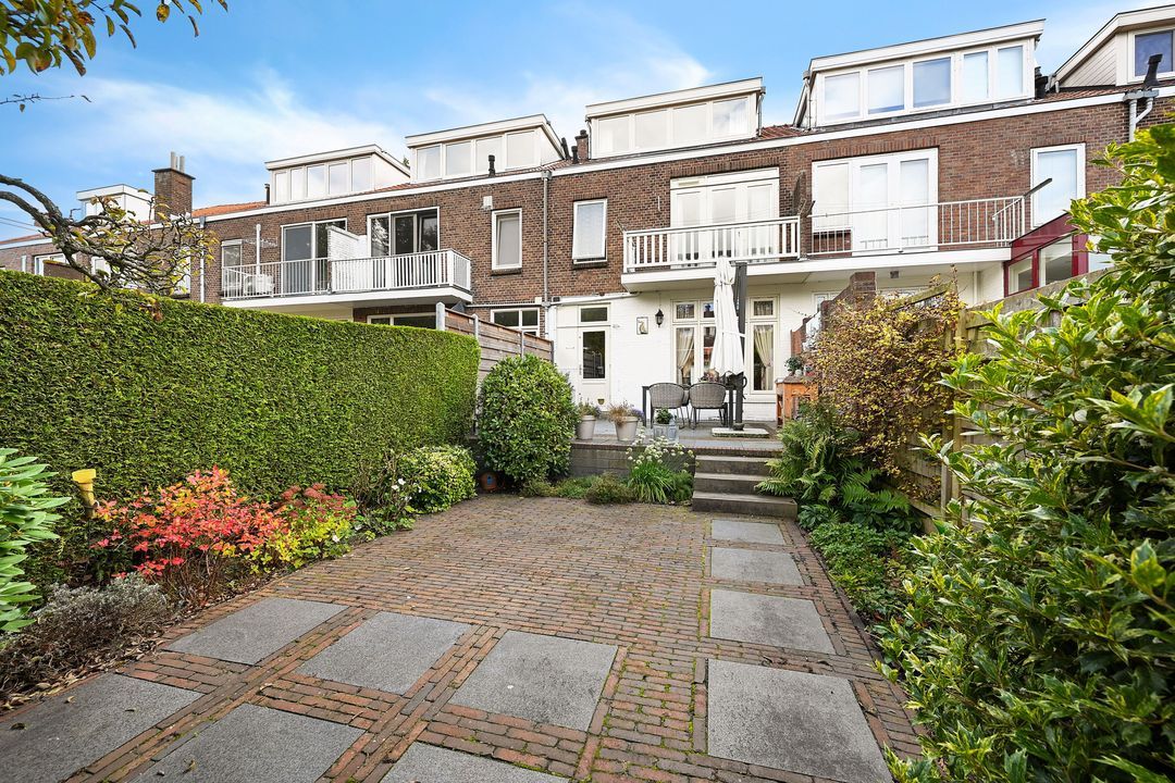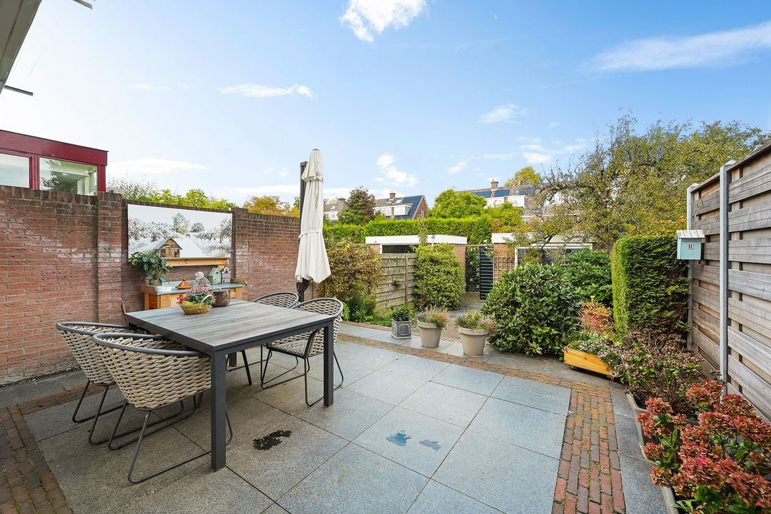 De diepe en zeer zonnige achtertuin ligt op het noordwesten maar heeft de gehele dag zon. Omdat alle tuinen in de wijk “Damsigt” goed van formaat zijn is de afstand tot de achterburen relatief groot wat de privacy zeer ten goede komt. De achtertuin heeft tevens een stenen schuur en een aparte bergkast en een achterom.