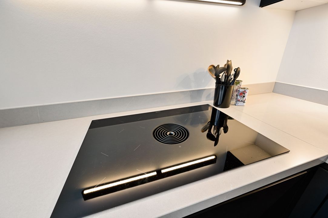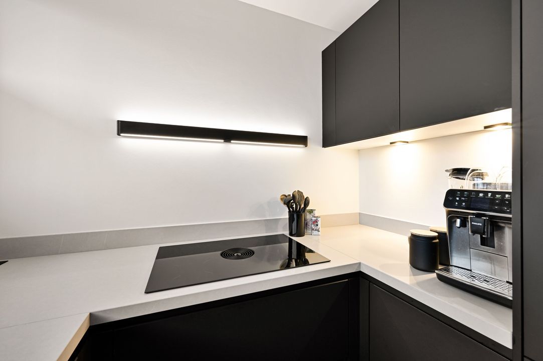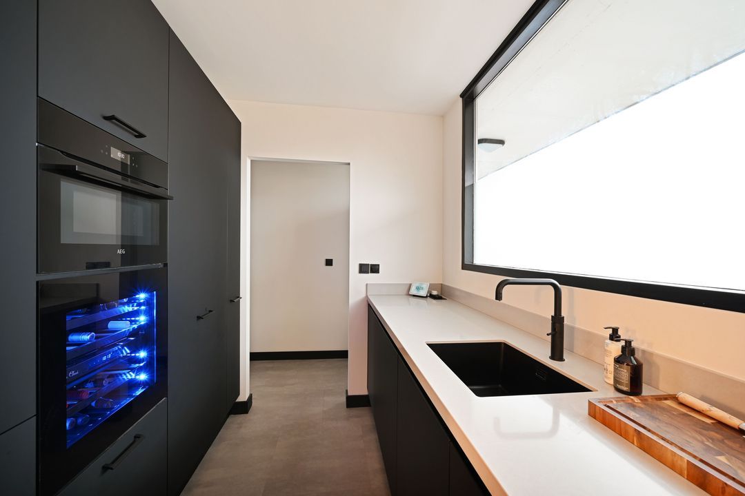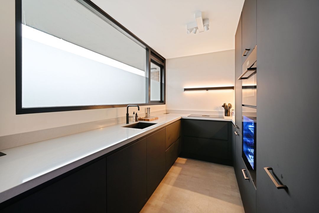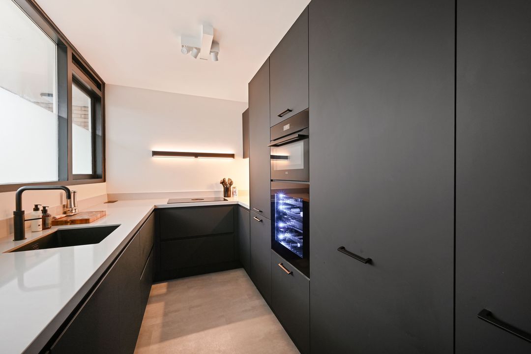 Aan de voorzijde ligt de luxe maatwerkkeuken (ca. 7,7 m²), in 2022 nieuw geplaatst door Bemmel & Kroon en voorzien van hoogwaardige inbouwapparatuur zoals een Quooker (incl. koud en bruisend water), Bora kookplaat en wijnkoeler. Op de keuken rust garantie tot 2032 (facturen aanwezig).