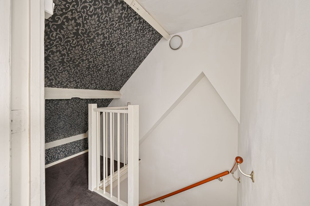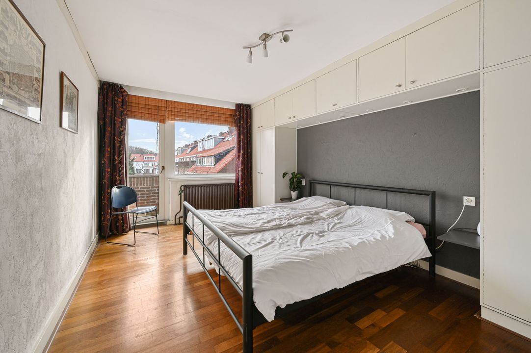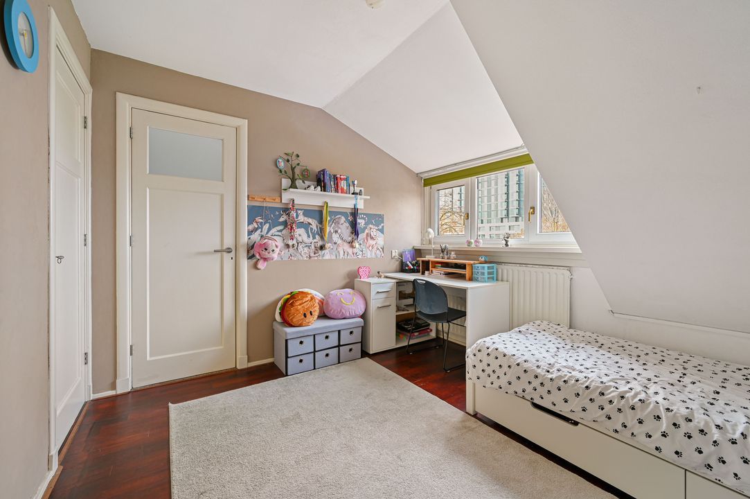 Op de overloop bevinden zich een separaat toilet en praktische bergruimte. Deze verdieping beschikt over twee slaapkamers en een achterzijkamer. De slaapkamer aan de achterzijde is ca. 13,9 m² groot en biedt toegang tot het tweede balkon van ca. 5,4 m². De slaapkamer aan de voorzijde meet ca. 9,5 m² en is voorzien van een dakkapel, wat zorgt voor extra ruimte en veel lichtinval.