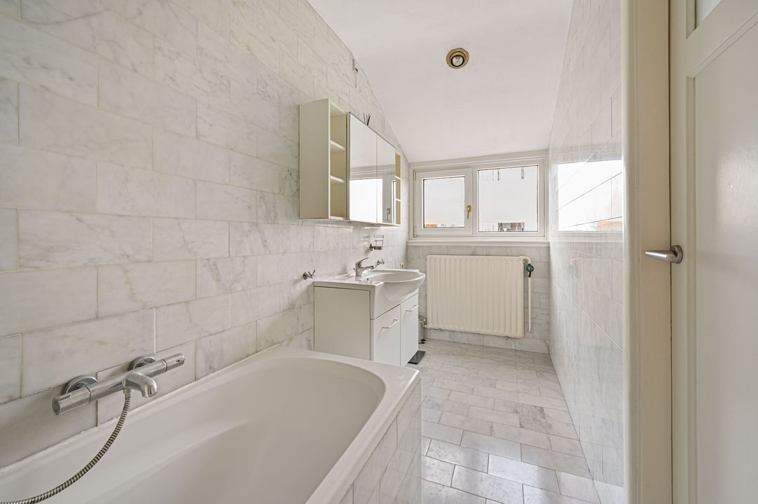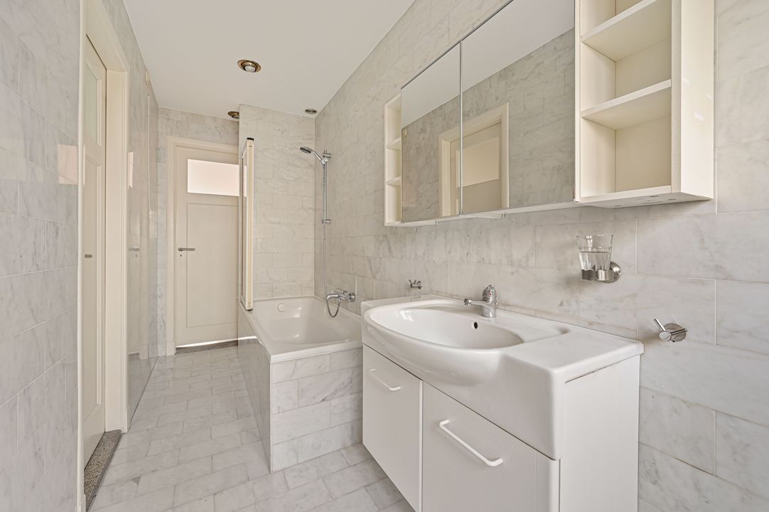 De badkamer is ca. 6,3 m², uitgevoerd met marmeren tegels en ingericht met een ligbad, wastafelmeubel en vaste kast.