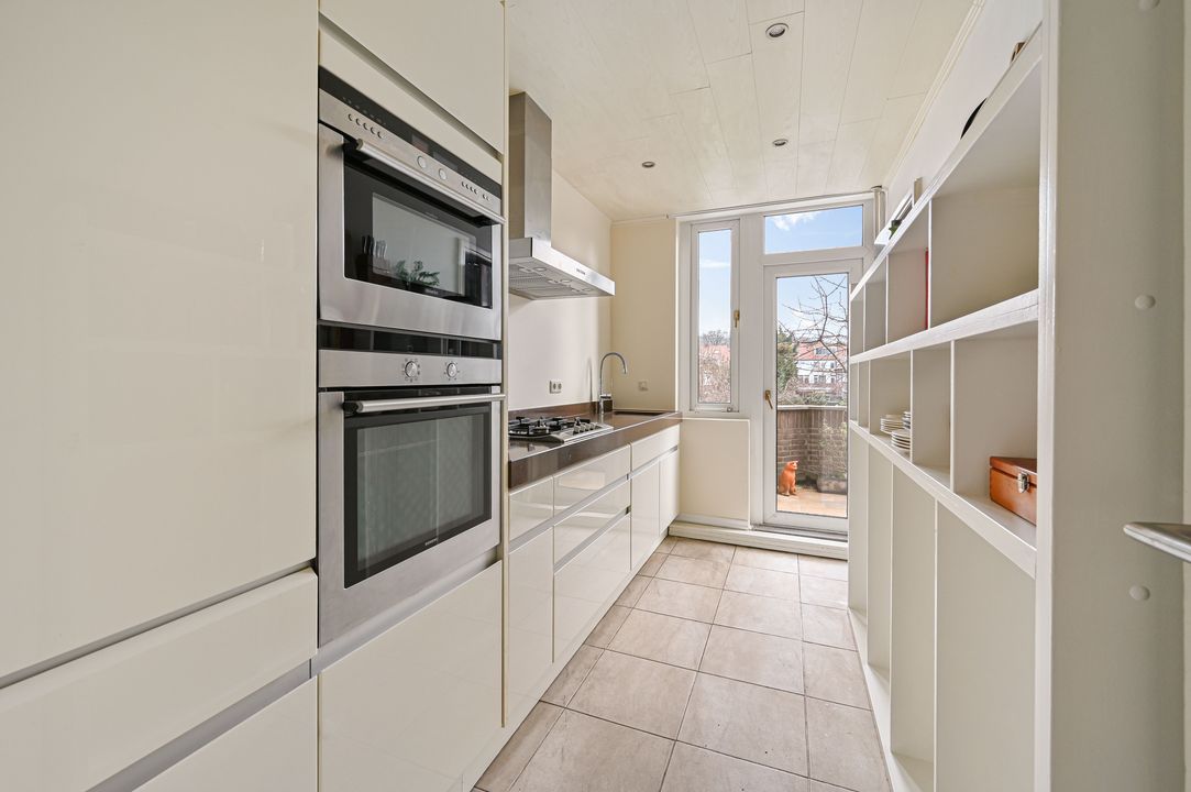 De keuken is ca. 7,9 m² en uitgevoerd als een strakke keuken in lichte kleurstelling, voorzien van diverse inbouwapparatuur. Vanuit de keuken is eveneens directe toegang tot het terras.
