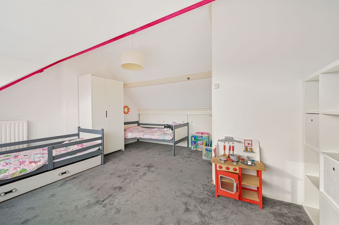 De overloop geeft toegang tot een royale slaapkamer van ca. 16,3 m², voorzien van een grote dakkapel aan de achterzijde. Deze verdieping is ideaal te gebruiken als master bedroom, werk- of hobbyruimte. De zolderverdieping biedt bovendien de mogelijkheid om te worden opgesplitst in twee kleinere (slaap)kamers. Een aansluiting voor sanitair is aanwezig en achter de knieschotten is extra bergruimte beschikbaar.