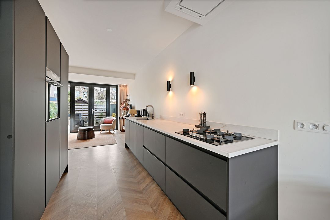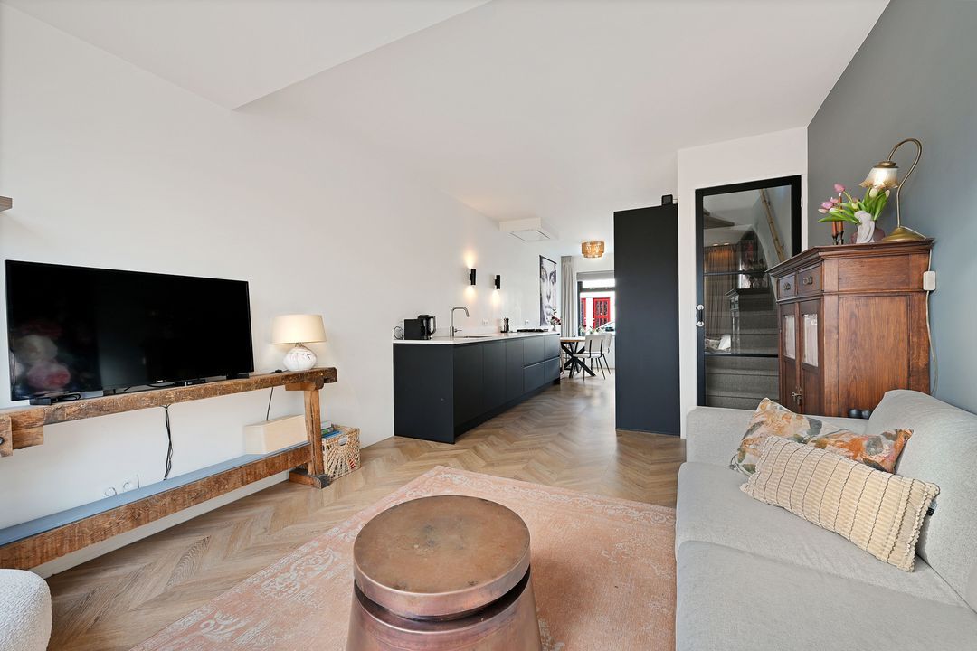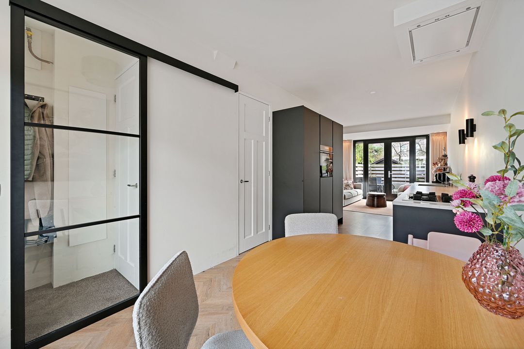 Direct vanbuiten is zichtbaar dat middels een dakopbouw de maximale inhoud uit de woning is gehaald. Entree aan de voorzijde. Hal met meterkast en deur naar de toiletruimte voorzien van modern hangende wandcloset. Bij binnenkomst in de woonkamer valt de slimme en unieke indeling direct op, met de open woonkeuken als kloppend hart van de ruimte. De stijlvolle en moderne keuken is van alle gebruikelijke inbouwapparatuur voorzien en verrassend ruim met veel werk- en opbergruimte. Aan de voorzijde is de knusse eetkamer. Aan de achterzijde ligt over de volle breedte een fijne zitkamer met een grote glazen pui met openslaande deuren naar de achtertuin. De achtertuin is op het zuidoosten gelegen en ligt aangenaam open dankzij de grote afstand naar de achtergelegen panden aan het Oosteinde. Hierdoor is er sprake van veel privacy en zonuren. Terugkijkend naar de achtergevel wordt ook hier duidelijk dat er is aangebouwd en opgebouwd en dus de volle potentie uit de woonoppervlakte is gehaald. De begane grondvloer is voorzien vloerverwarming en een afgewerkt met een fraaie vloer met Hongaarse punt.