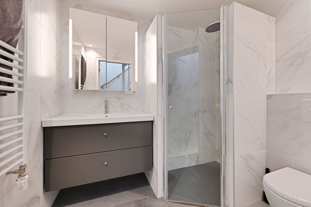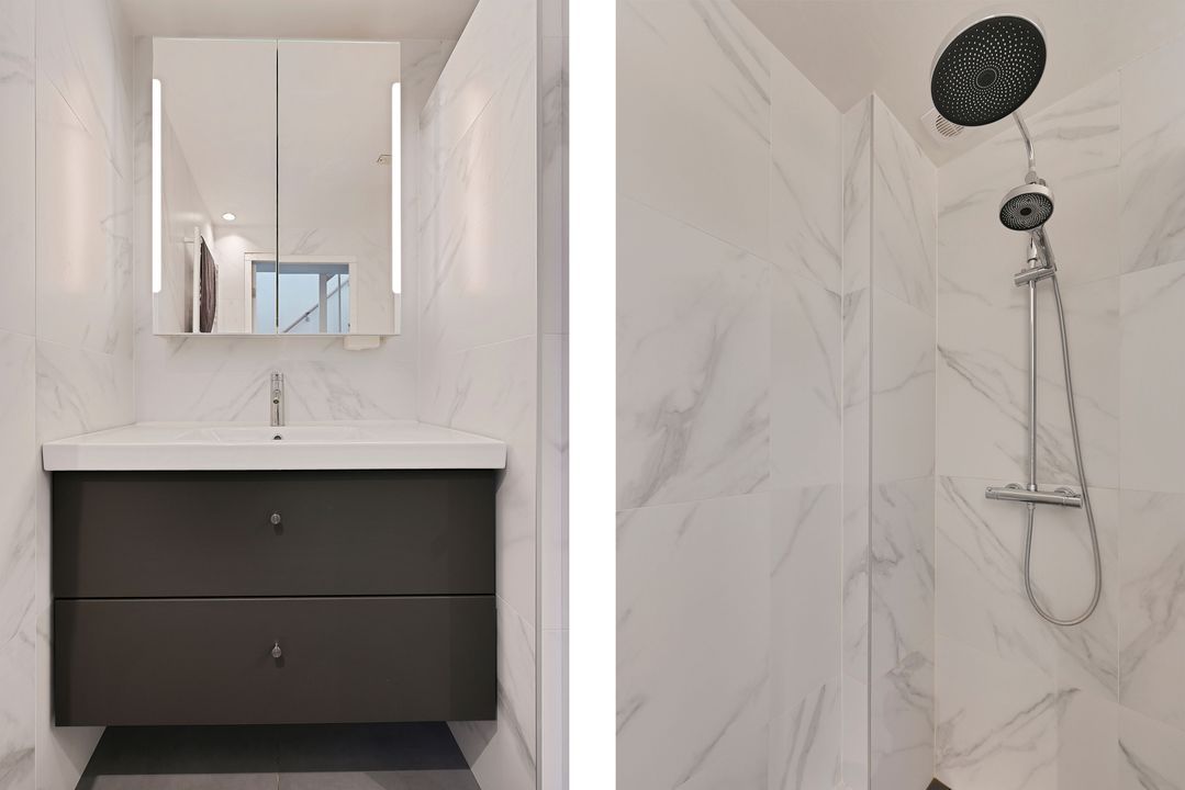 1e verdieping: Overloop met toegang tot alle vertrekken. Slaapkamer over de volledige breedte aan de voorzijde (ca. 3,6 x 2,4 m) en tweede (hoofd)slaapkamer aan de achterzijde (ca. 3,8 x 3,6 m) met toegang tot het verruimde balkon aan de achterzijde. Moderne tussengelegen badkamer voorzien van inloopdouche, 2e toilet en wastafelmeubel.