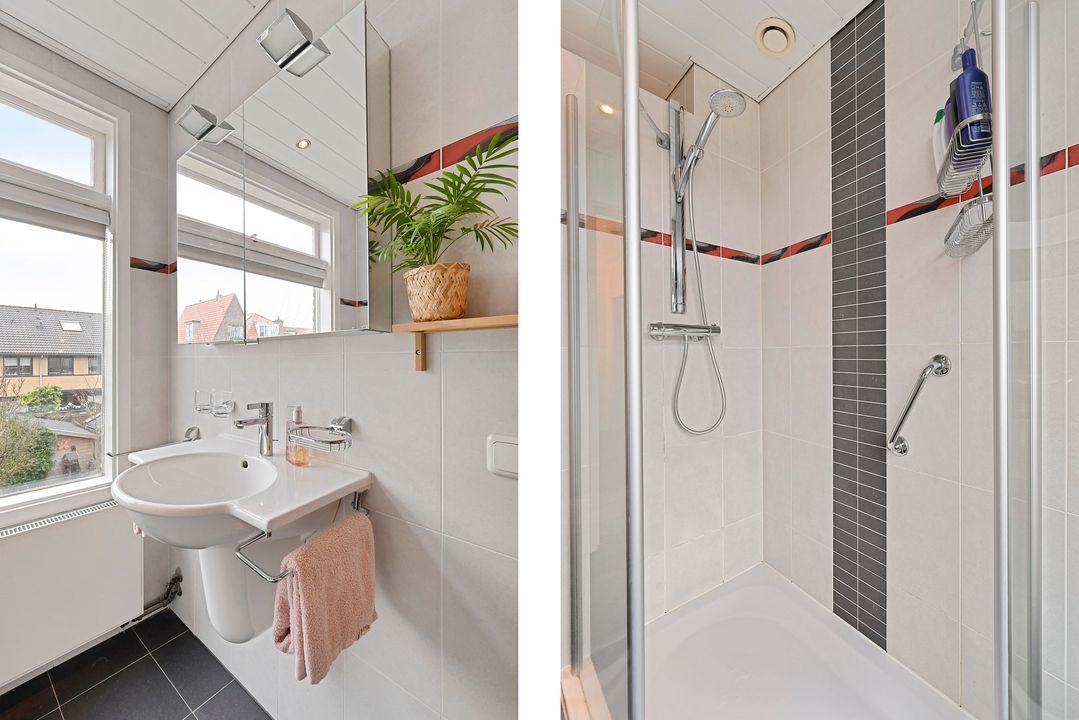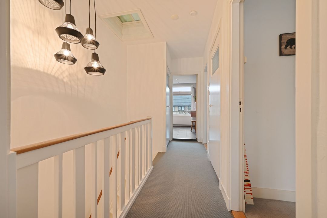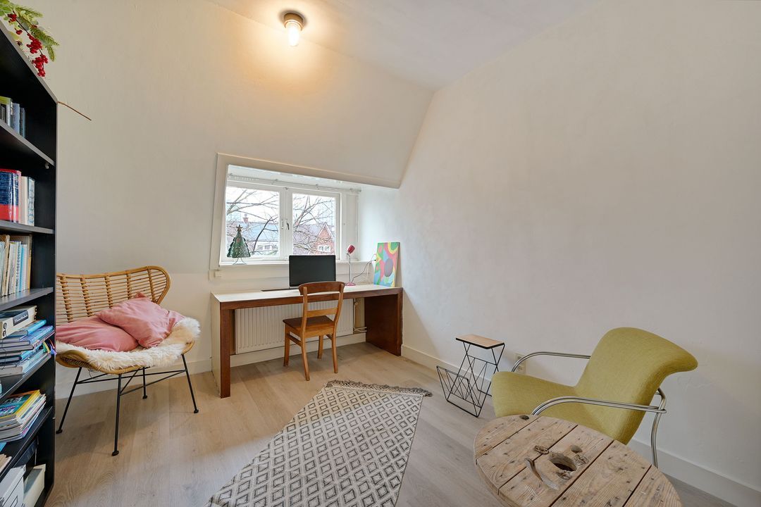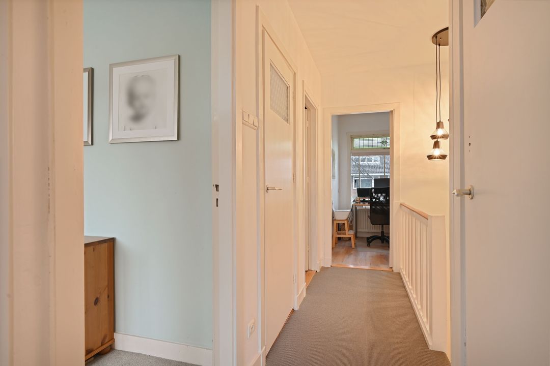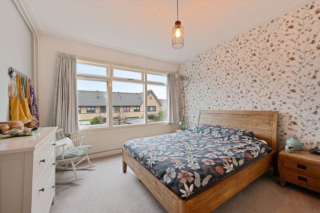 Fraai trappenhuis naar de eerste verdieping . De overloop biedt toegang tot alle vertrekken en beschikt over een separaat toilet. Aan de voorzijde bevindt zich een ruime slaapkamer (ca. 3,8 x 4,1 m) met vaste kast. Daarnaast ligt een tweede kamer aan de voorzijde, ideaal als studeer- of babykamer. Aan de achterzijde bevindt zich een riante derde slaapkamer (ca. 3,8 x 3,95 m) met fraai uitzicht over de groene tuin. Vanuit deze kamer is tevens de vaste kast onder de trap naar de tweede verdieping bereikbaar. De moderne, lichte badkamer is betegeld en voorzien van een wastafel, spiegelkast en douche.