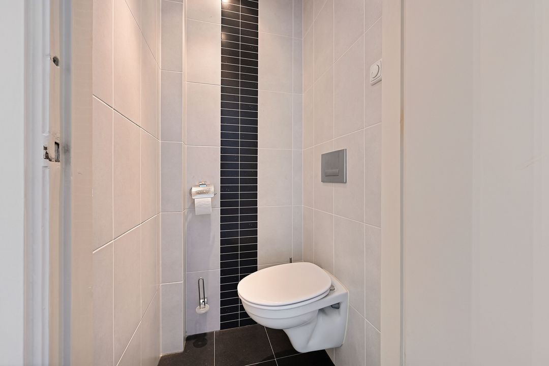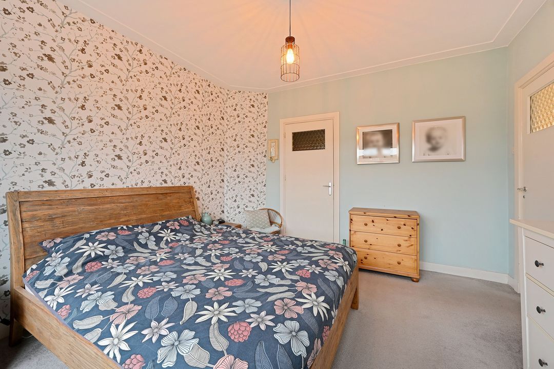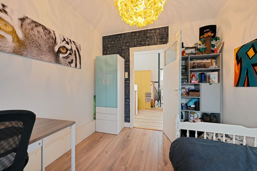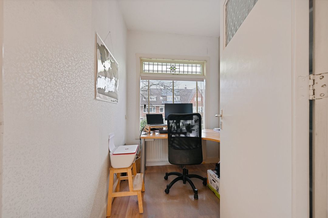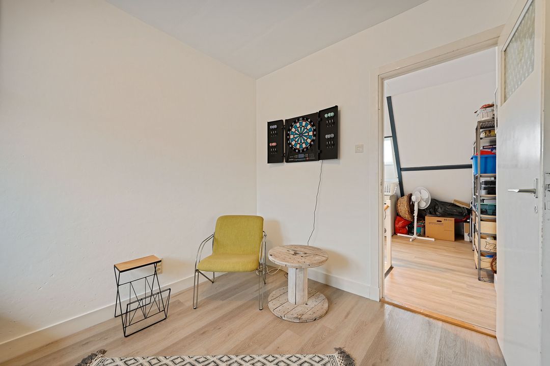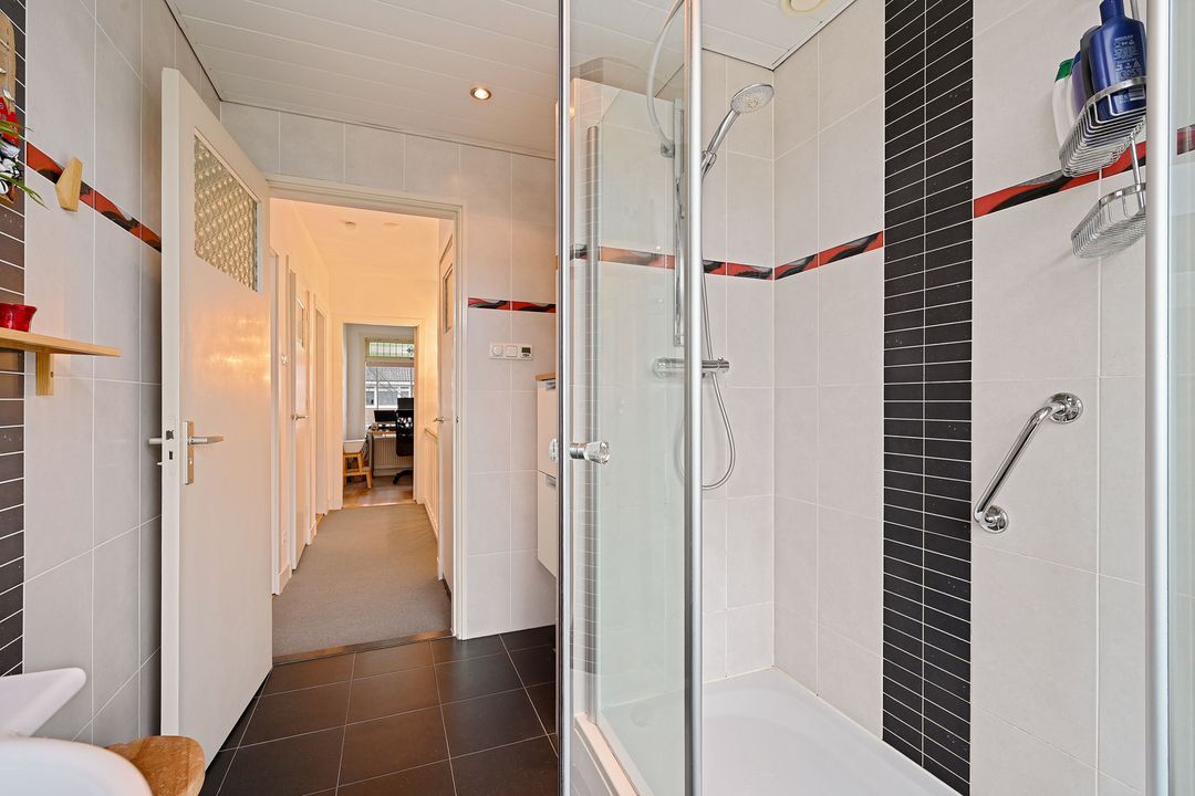Fraai trappenhuis naar de eerste verdieping . De overloop biedt toegang tot alle vertrekken en beschikt over een separaat toilet. Aan de voorzijde bevindt zich een ruime slaapkamer (ca. 3,8 x 4,1 m) met vaste kast. Daarnaast ligt een tweede kamer aan de voorzijde, ideaal als studeer- of babykamer. Aan de achterzijde bevindt zich een riante derde slaapkamer (ca. 3,8 x 3,95 m) met fraai uitzicht over de groene tuin. Vanuit deze kamer is tevens de vaste kast onder de trap naar de tweede verdieping bereikbaar. De moderne, lichte badkamer is betegeld en voorzien van een wastafel, spiegelkast en douche.