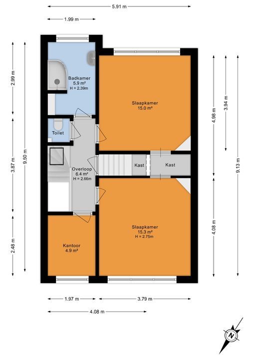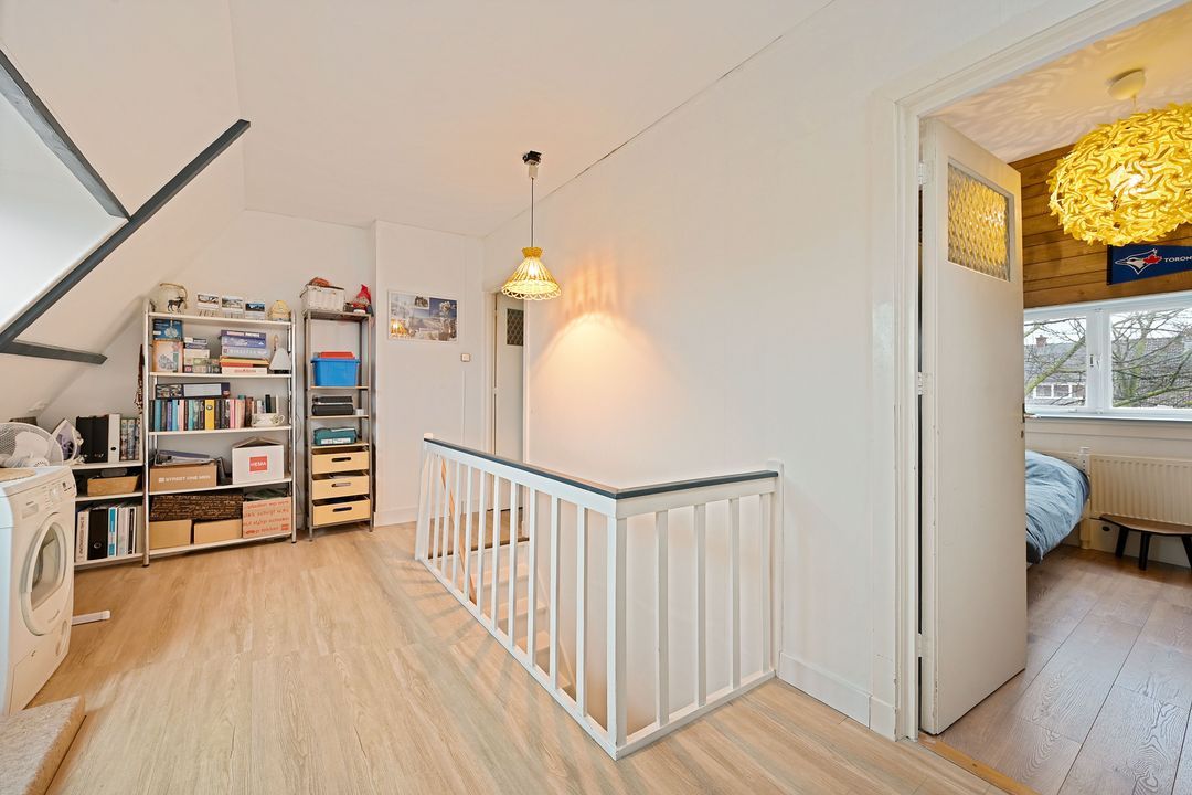 Op de tweede verdieping bevindt zich een ruime overloop met opstelplaats voor wasmachine, droger en cv-installatie.