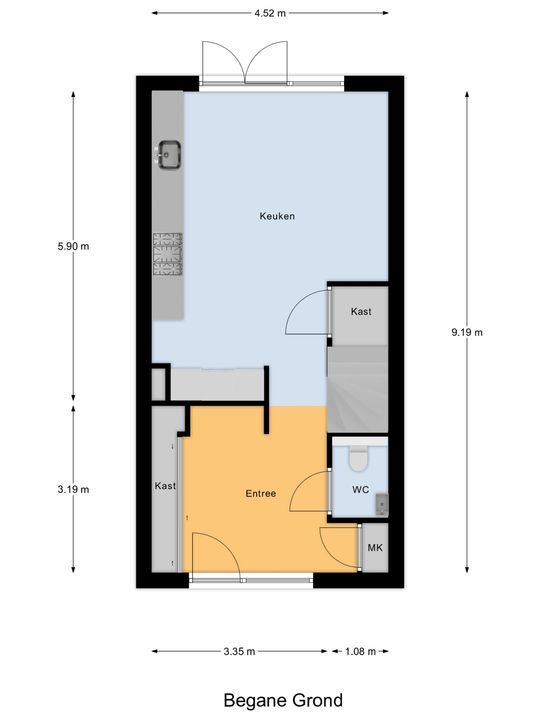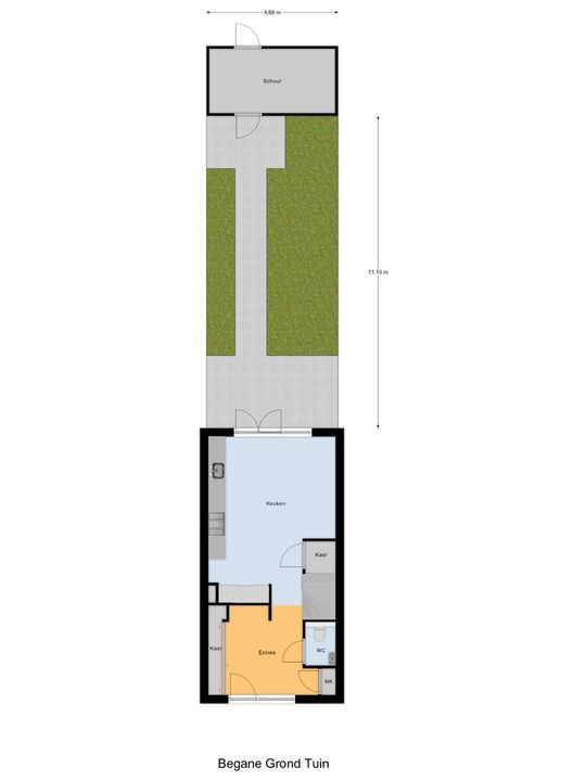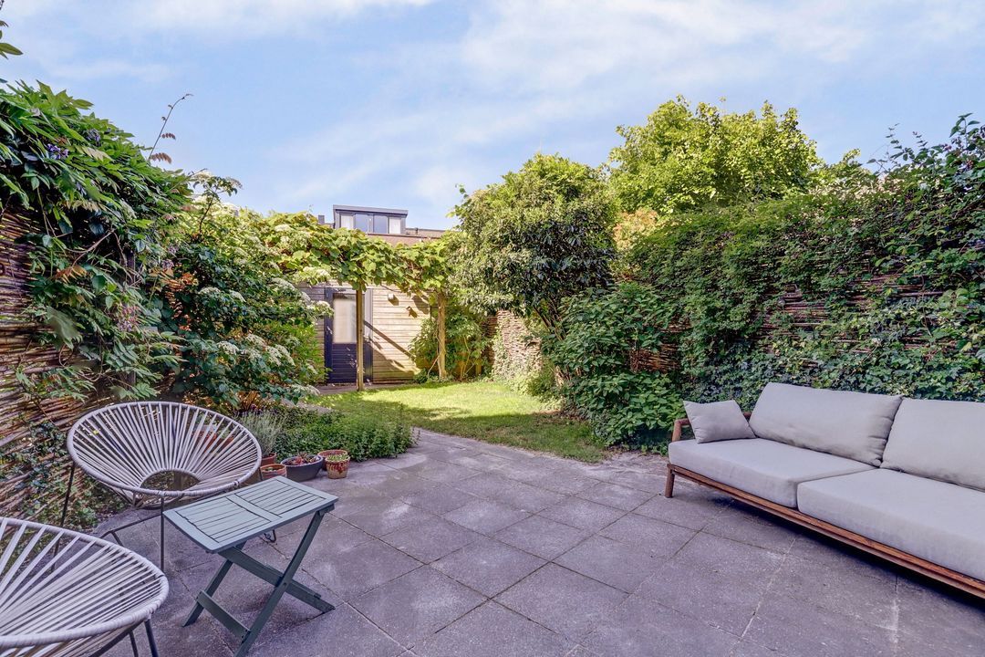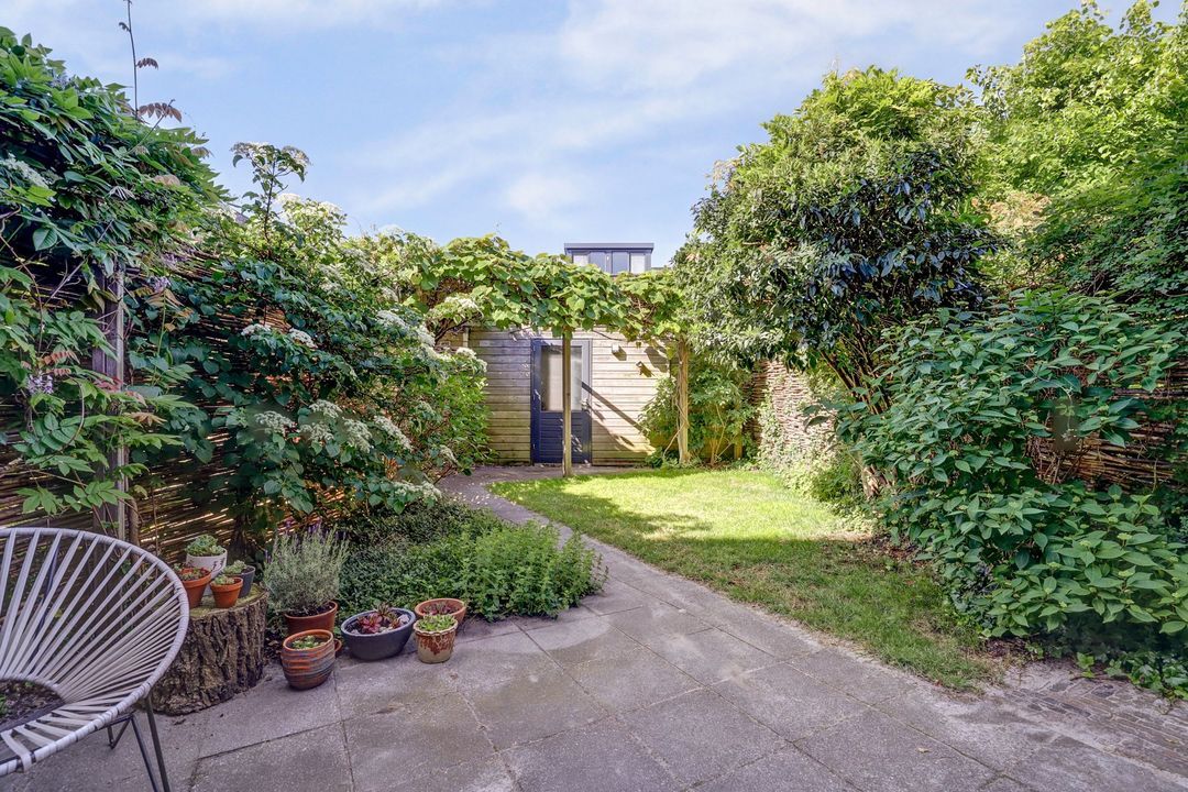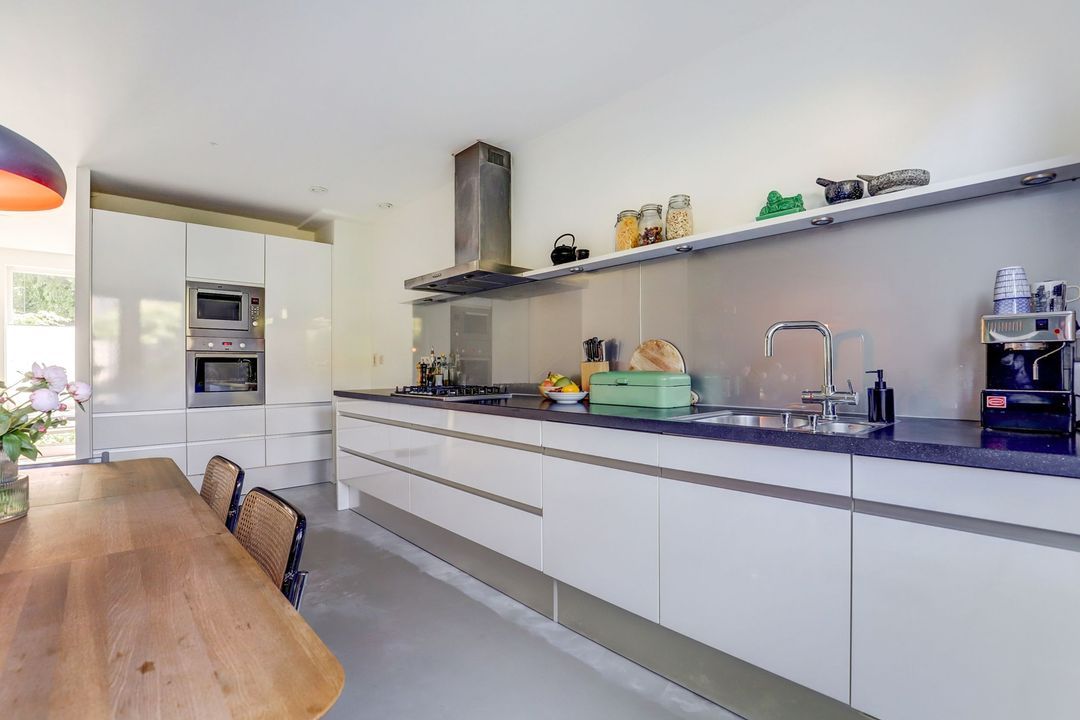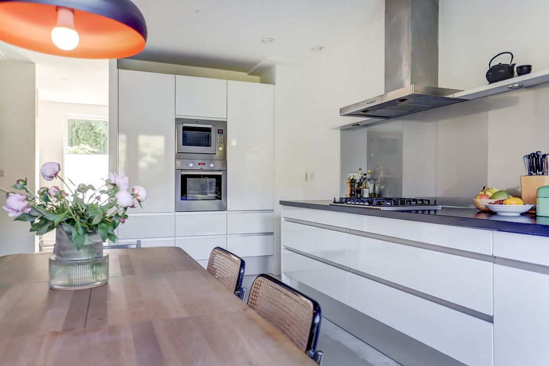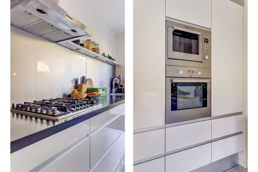 Via de voortuin bereikt u de entree met ruime hal (3,4 x 3,2 m), garderoberuimte, kastenwand, meterkast en modern toilet met vrijhangend closet en fontein. De begane grond is volledig ingericht als luxe woonkeuken (5,9 x 4,5 m), voorzien van een L-vormige keukenopstelling met inbouwapparatuur (koelkast, vriezer, vaatwasser, afzuigkap, 5-pits gasfornuis, heteluchtoven en magnetron). Dankzij de openslaande deuren staat de keuken direct in verbinding met de zonnige achtertuin (11,0 x 4,7 m) op het zuidwesten. Hier vindt u ook een ruime schuur (4,7 x 2,3 m) en een praktische achterom. Aan de achterzijde is bovendien een elektrisch zonnescherm geplaatst.