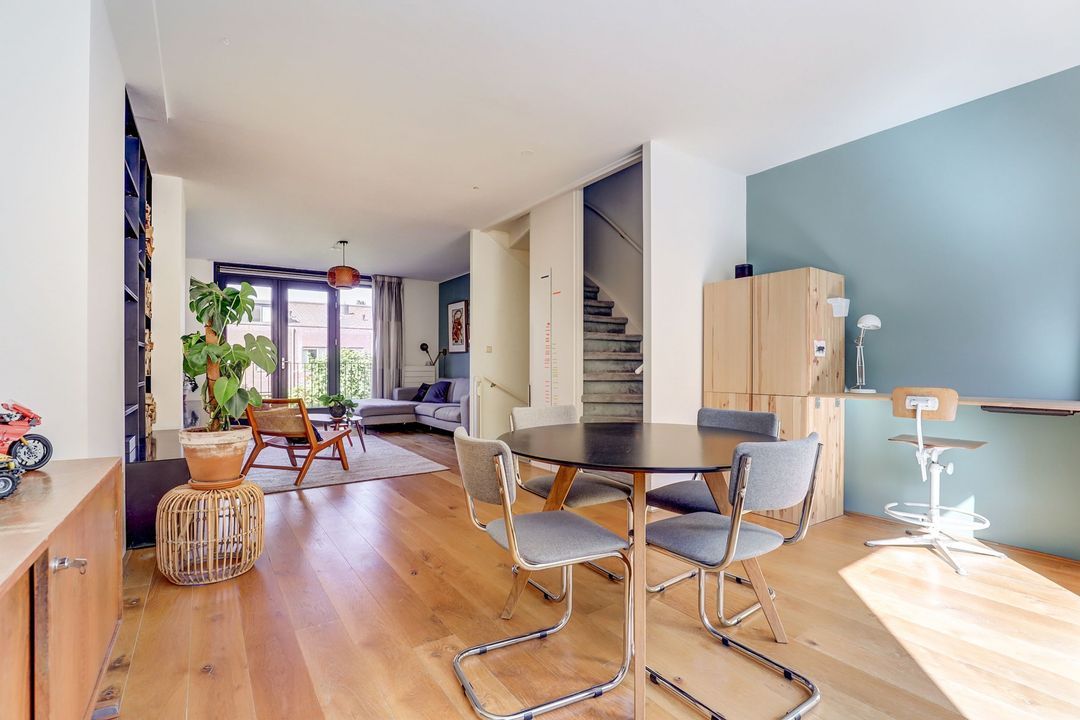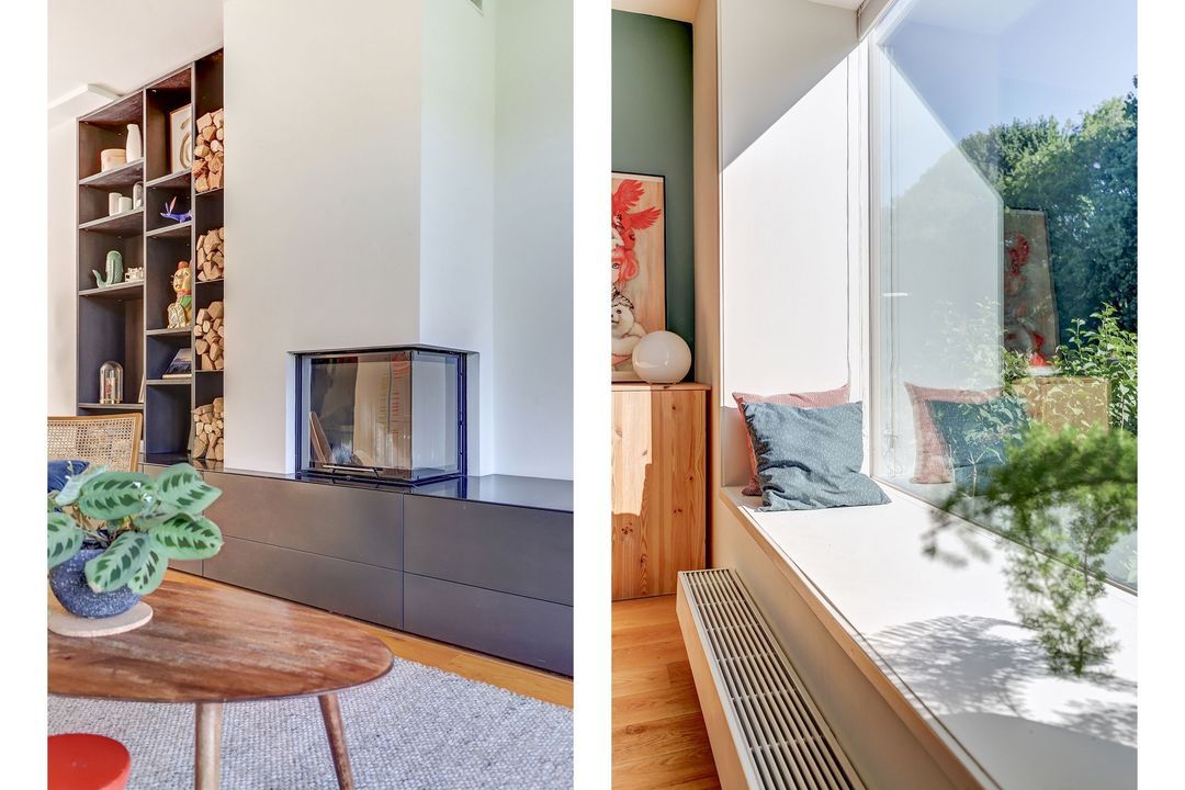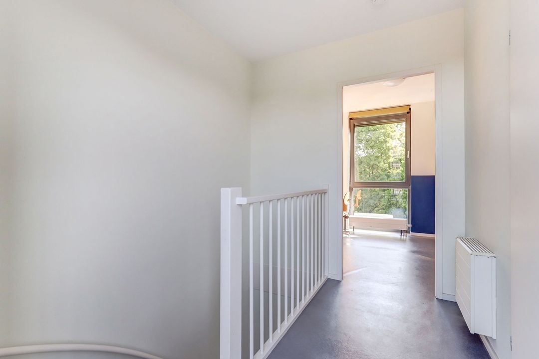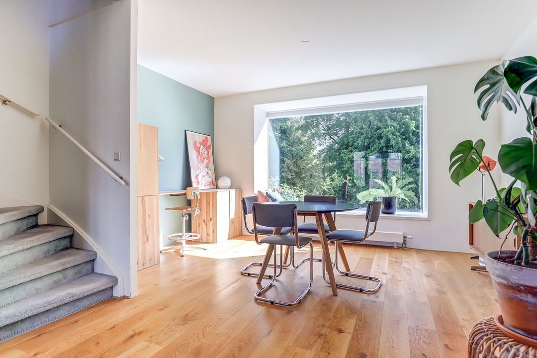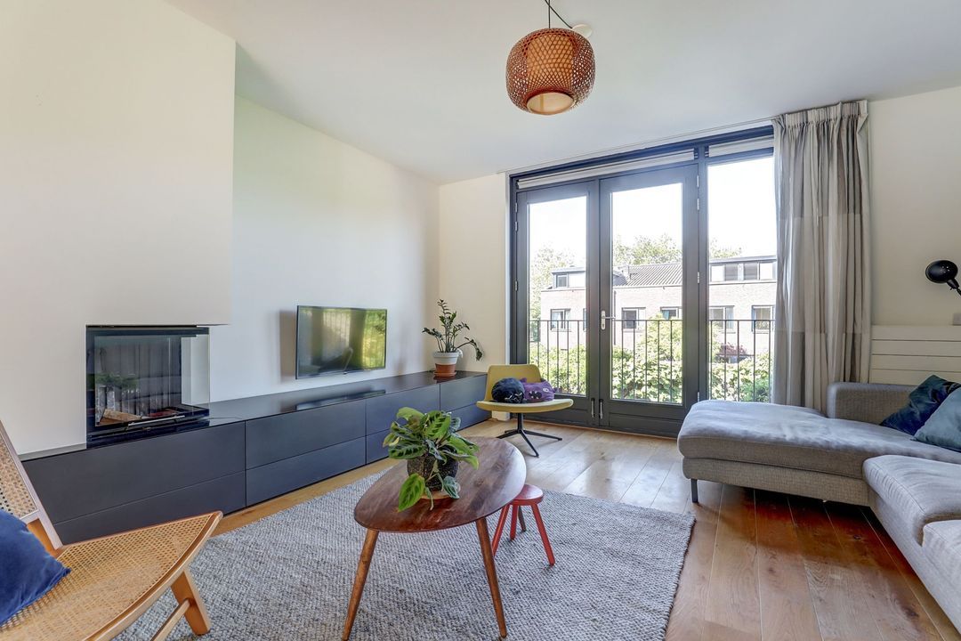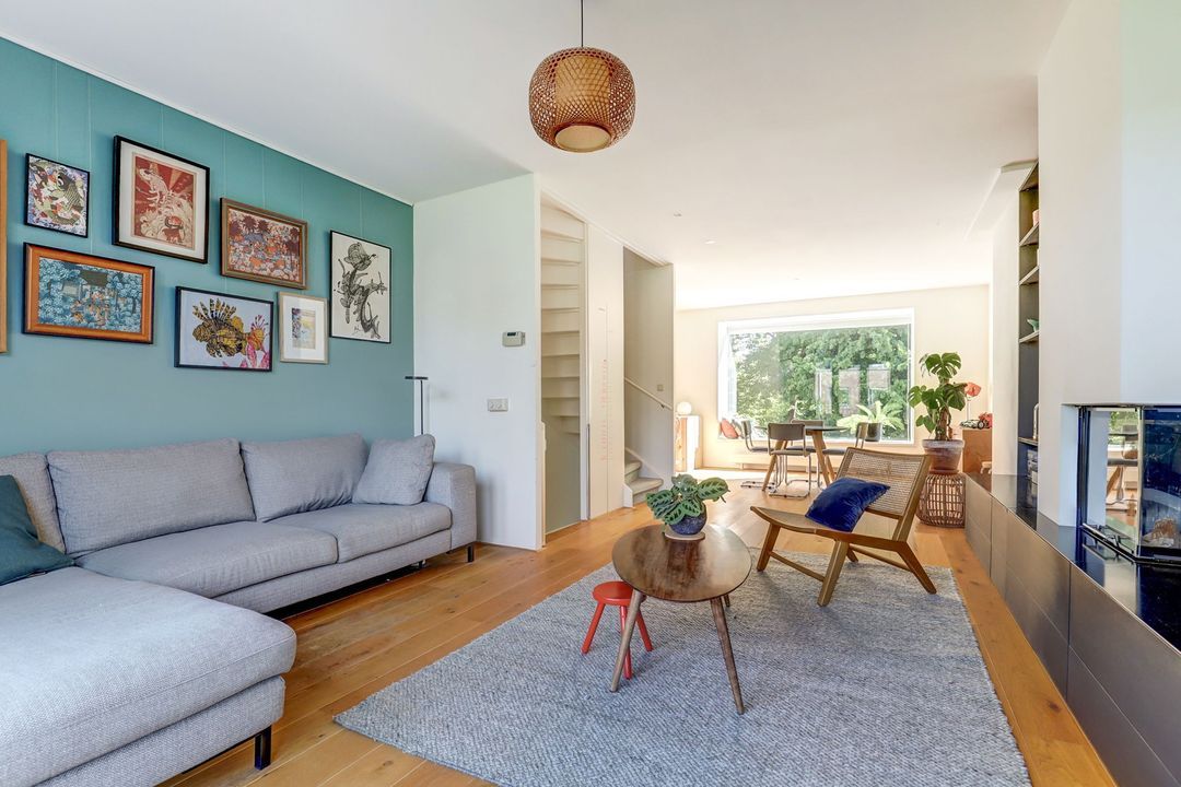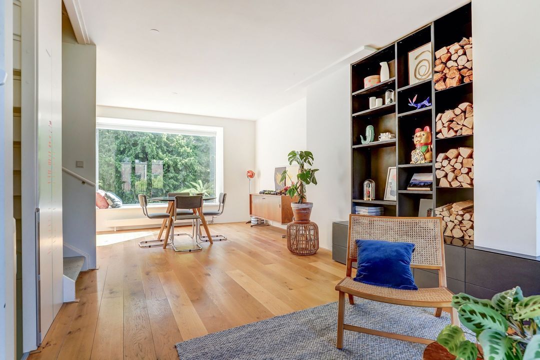 Op de eerste verdieping bevindt zich de woonkamer (9,3 x 4,5 m) – een opvallende en unieke indeling die zorgt voor veel licht, privacy en een prachtig vrij uitzicht over park ’t Loo. De ruimte is voorzien van een fraaie houten vloer en open haard.