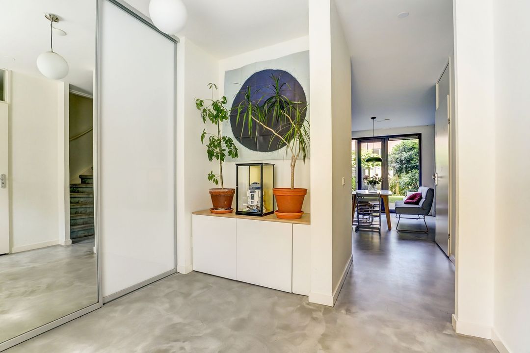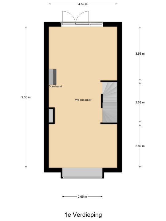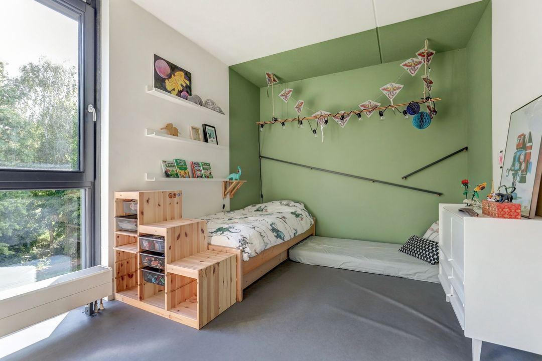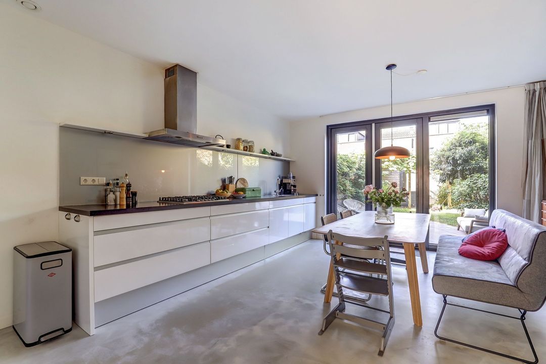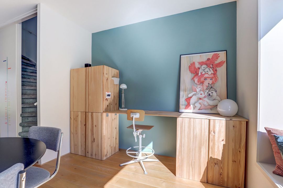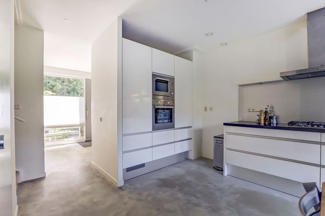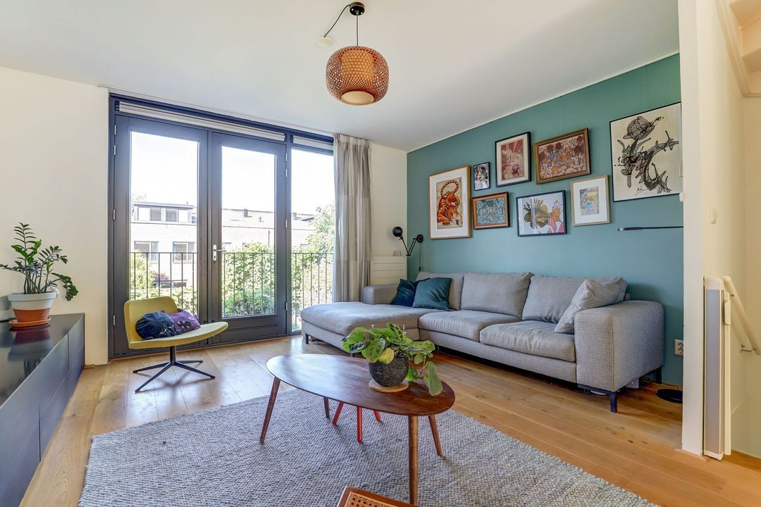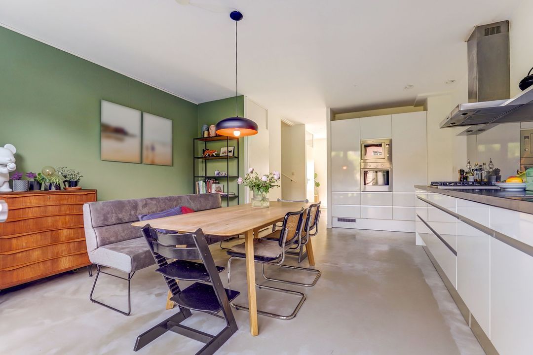 Op de eerste verdieping bevindt zich de woonkamer (9,3 x 4,5 m) – een opvallende en unieke indeling die zorgt voor veel licht, privacy en een prachtig vrij uitzicht over park ’t Loo. De ruimte is voorzien van een fraaie houten vloer en open haard.