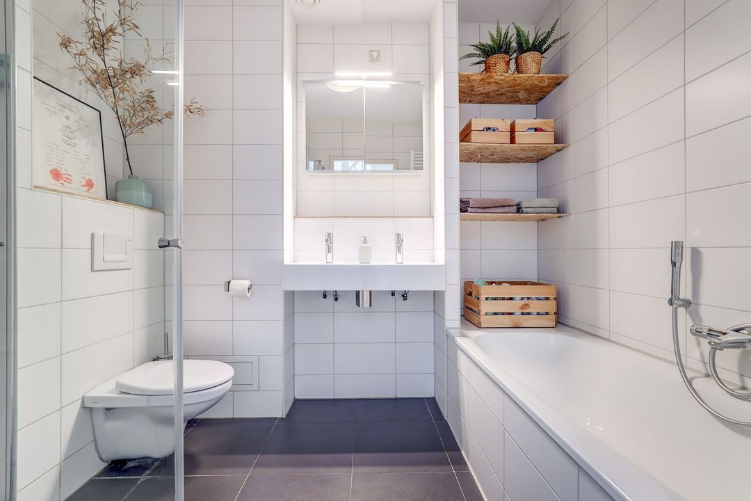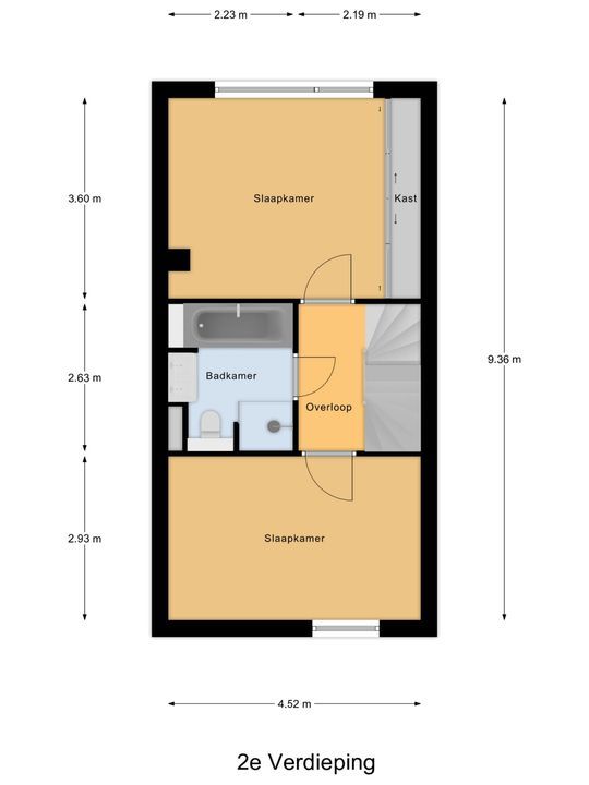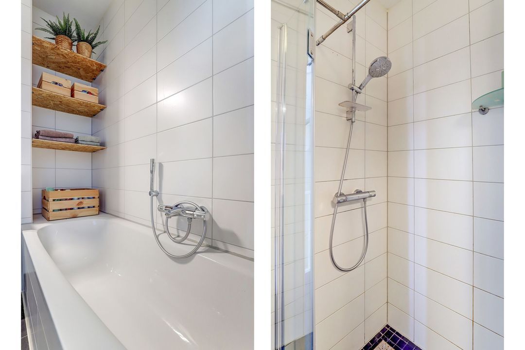 De tweede verdieping telt twee royale slaapkamers: aan de achterzijde (3,6 x 4,5 m) met kastenwand en aan de voorzijde (2,9 x 4,5 m), beide over de volle breedte van de woning. De moderne badkamer (2,6 x 2,3 m) ligt centraal en beschikt over een ligbad, separate douche, wastafelmeubel en tweede toilet.