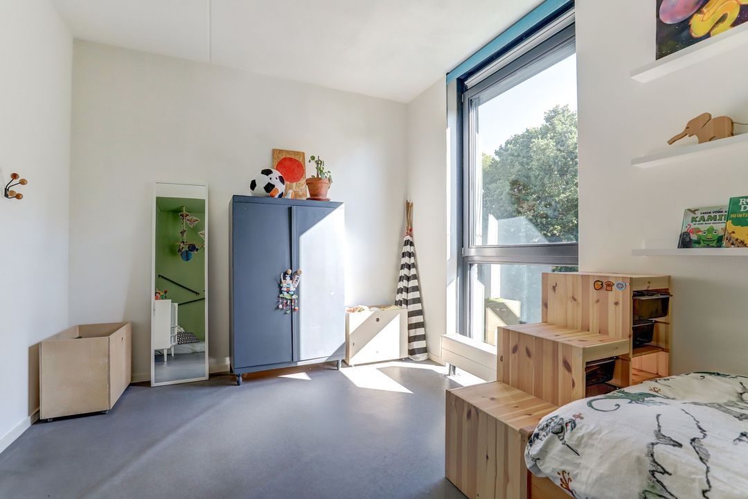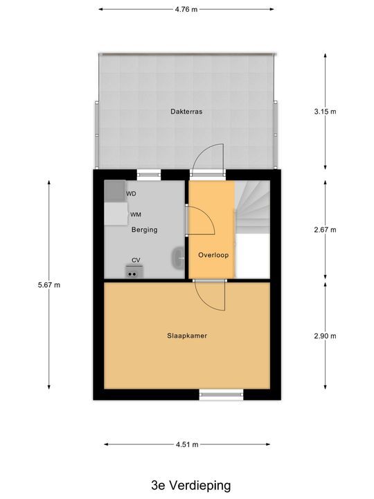 Op de derde verdieping vindt u een ruime slaapkamer (2,9 x 4,5 m) over de volle breedte, een berging (2,7 x 2,3 m) met wastafel, wasmachine- en drogeraansluiting, de cv-ketel (Remeha Tzerra 2015) en de mechanische ventilatie-unit. Via de overloop bereikt u het grote, rustig gelegen dakterras (4,8 x 3,2 m) aan de achterzijde, ideaal om in alle privacy van de zon te genieten.