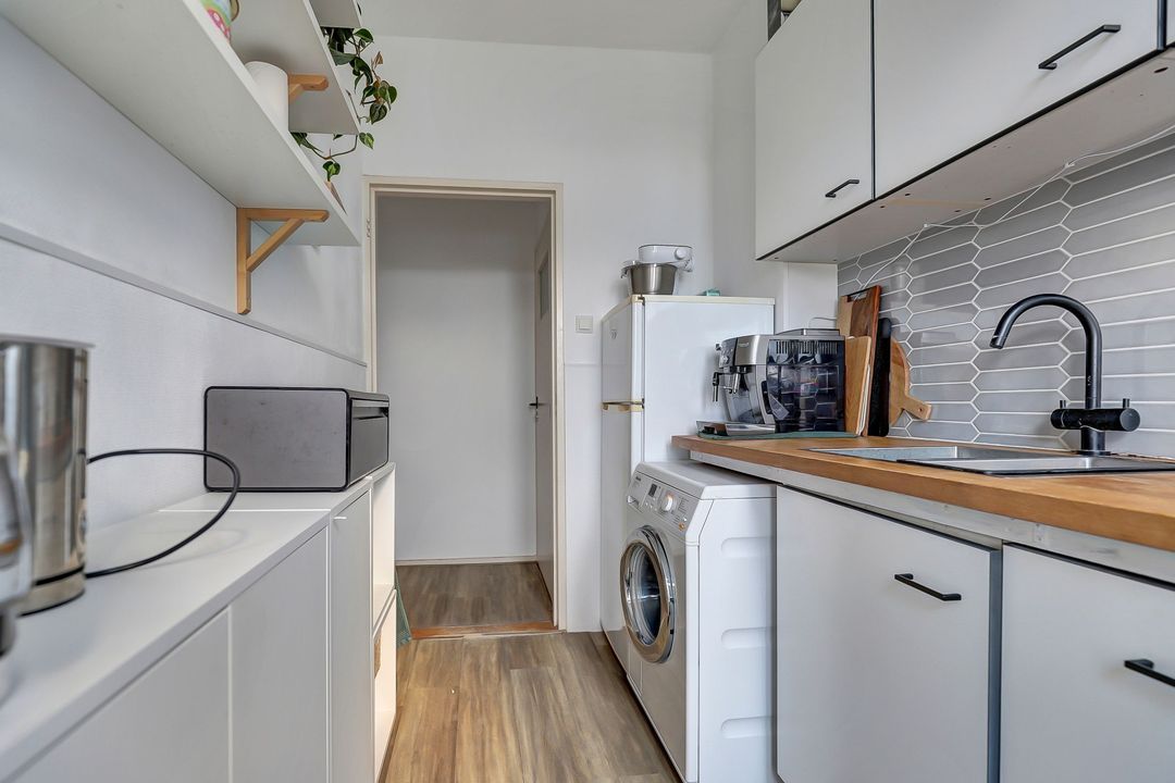 De keuken is uitgevoerd in een frisse, moderne stijl met een houten werkblad, lichte kastfronten en een stijlvolle tegelachterwand. Tevens voorzien van diverse inbouwapparatuur en toegang tot het balkon op het westen, waar u tot in de avondzon heerlijk kunt genieten.