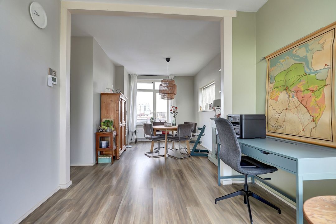 De lichte woon-/eetkamer strekt zich uit over de volle diepte van het appartement en heeft grote ramen aan twee zijden, waardoor het hier altijd licht en prettig wonen is. Vanuit de woonkamer is er een mooi, groen uitzicht richting het park. De moderne afwerking, lichte wanden en laminaatvloer zorgen voor een eigentijdse sfeer.