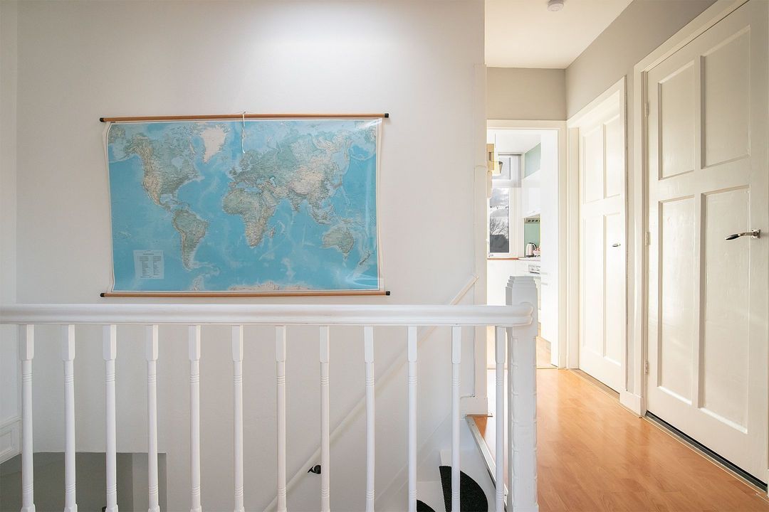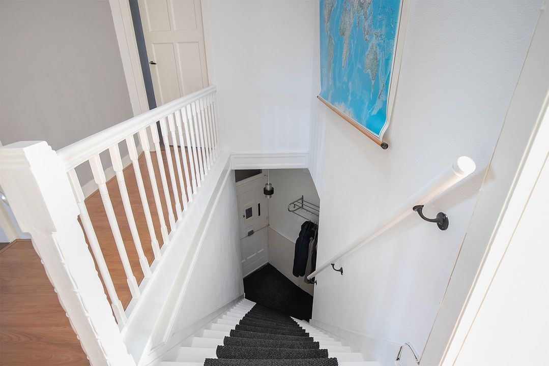 1e Verdieping: Entree. Hal met meterkast en mooie binnentrap naar de 2e verdieping.
