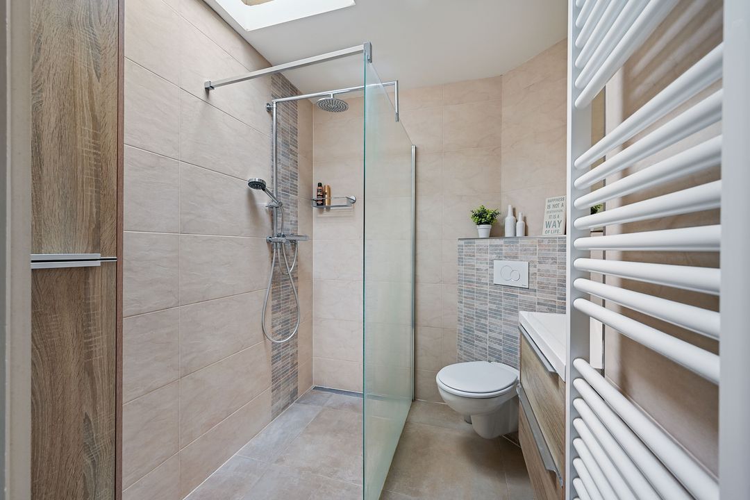 Op de eerste verdieping is een ruime overloop met toegang tot alle vertrekken en een diepe vaste kast. Aan de voorzijde bevinden zich 2 slaapkamers (resp. ca. 3,1 x 3,0 x 3,0 x 2,2 m) en aan de achterzijde zijn eveneens 2 slaapkamers waaronder de hoofdslaapkamer met uitzicht over de vijver aan de achterzijde (resp. ca. 4,2 x 2,9 m en 3,2 x 2,1 m). Nette badkamer met fijne daglichttoetreding dankzij het dakraam en een inloopdouche, toilet en wastafelmeubel.